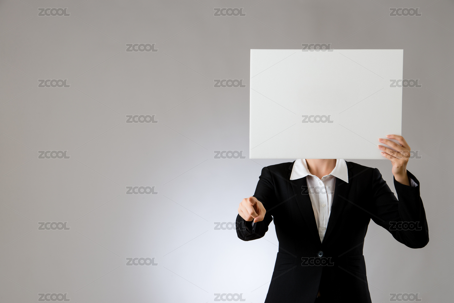 年轻貌美的女子指向你的手指,拿着空纸板。隔绝在灰色背景。混血亚洲的中国模式。
