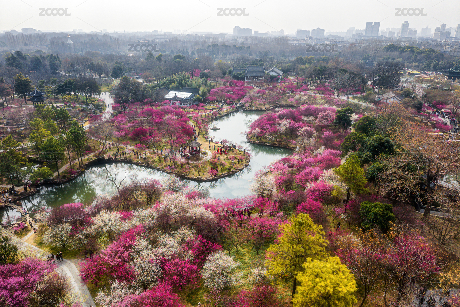 航拍扬州瘦西湖湖上梅林梅花盛开的盛景