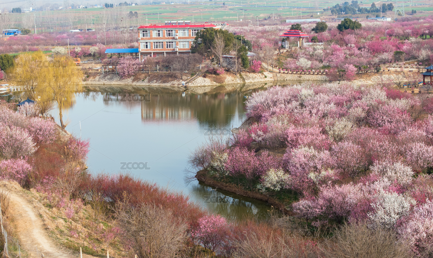 航拍河南南阳塔子山梅花基地初春盛开的梅花