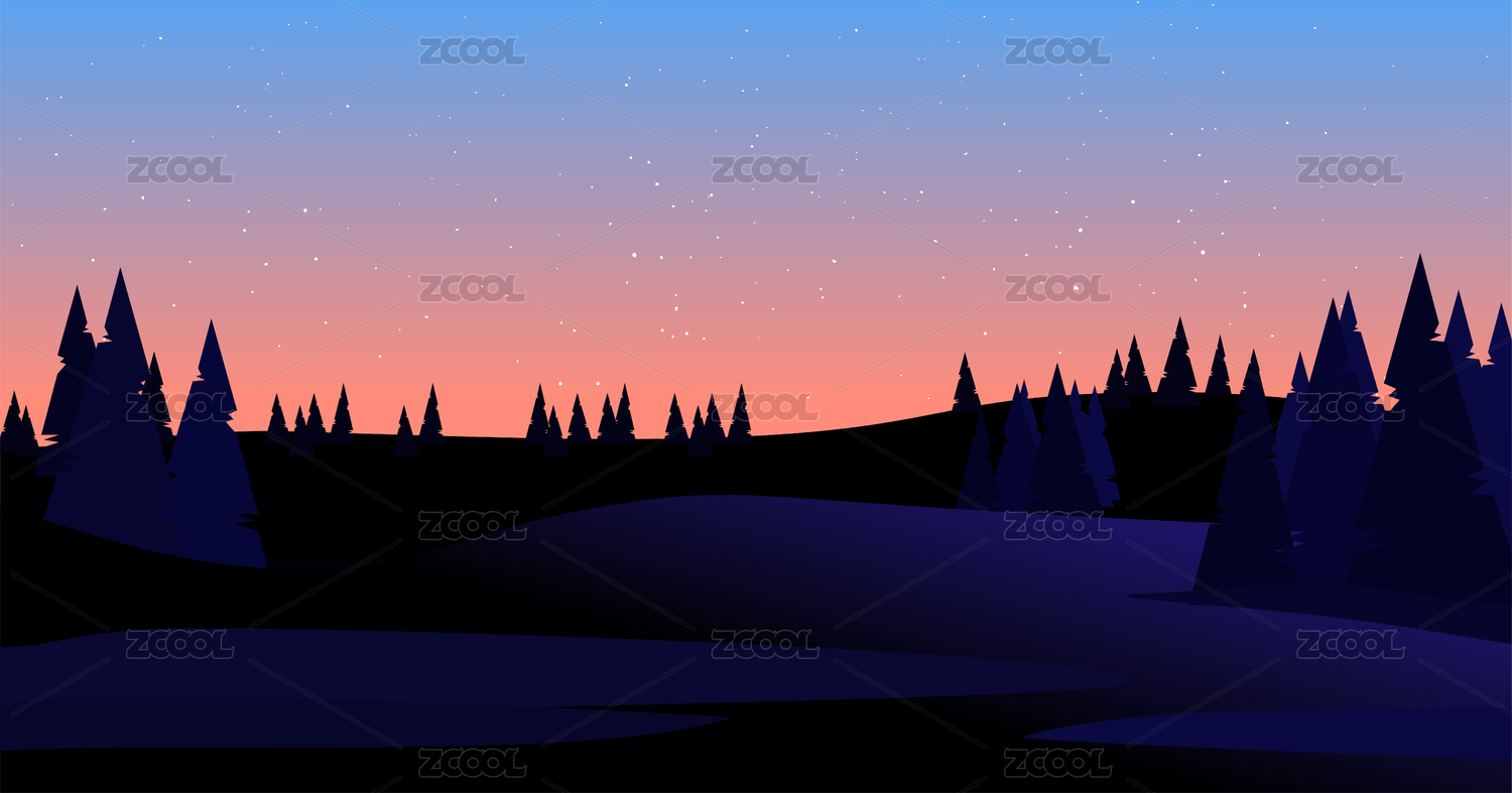 清晨或傍晚的天空,带小树林的山丘矢量背景