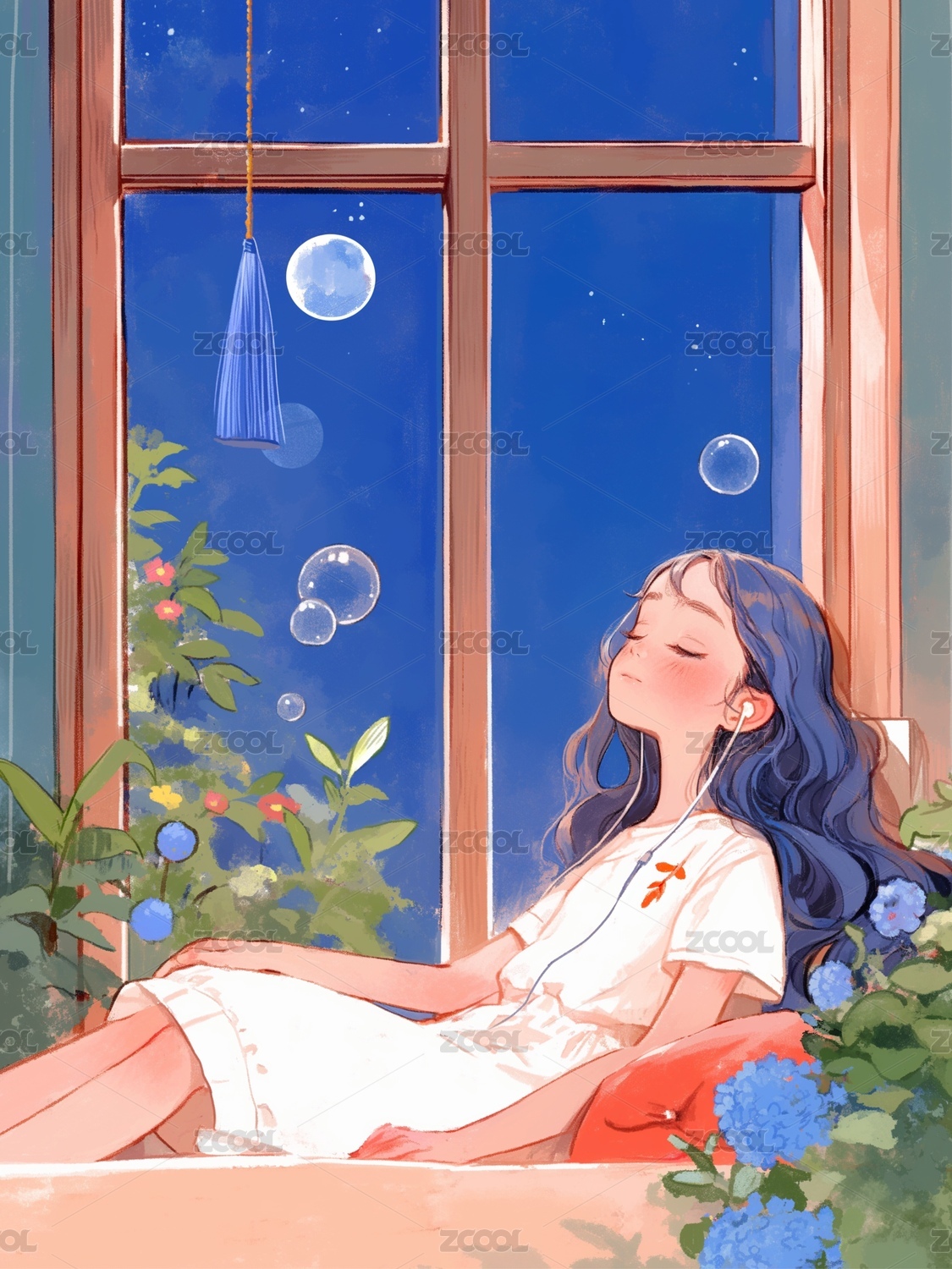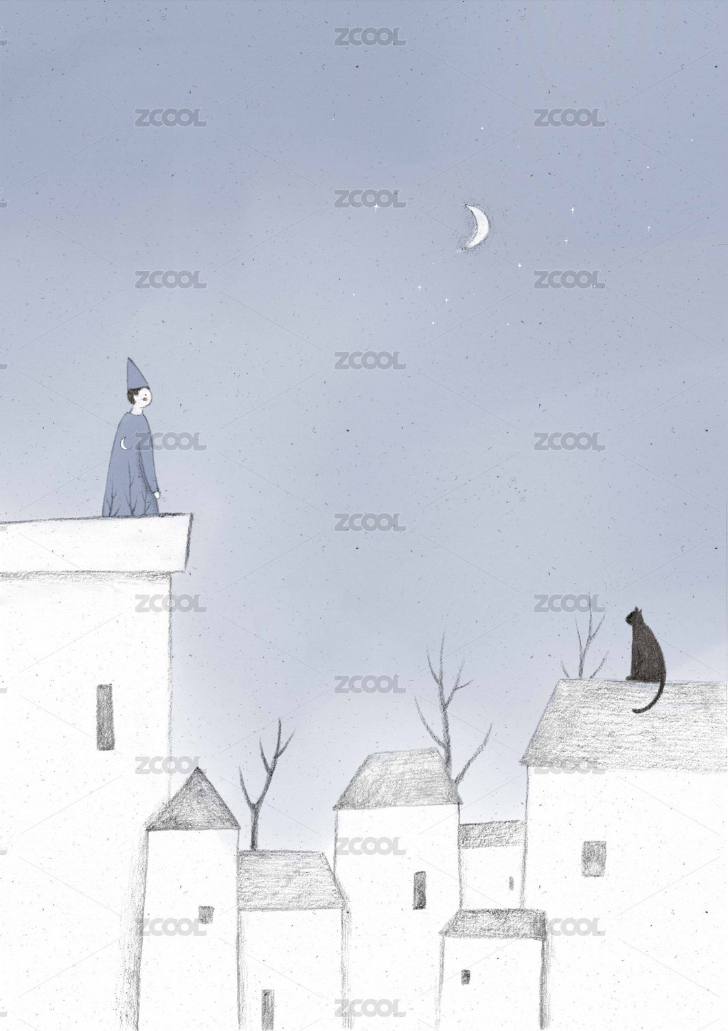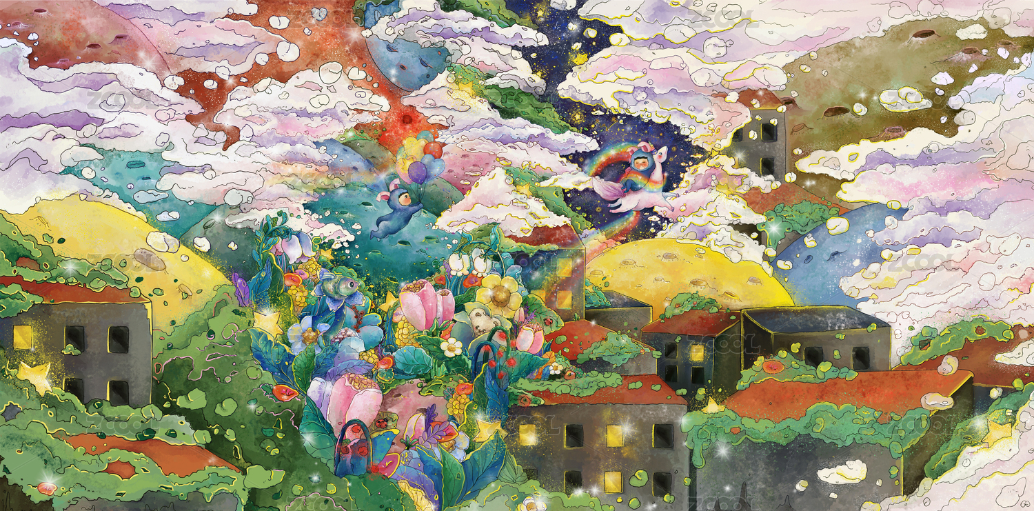 手绘卡通插画-在梦境里的城市间自由飞翔