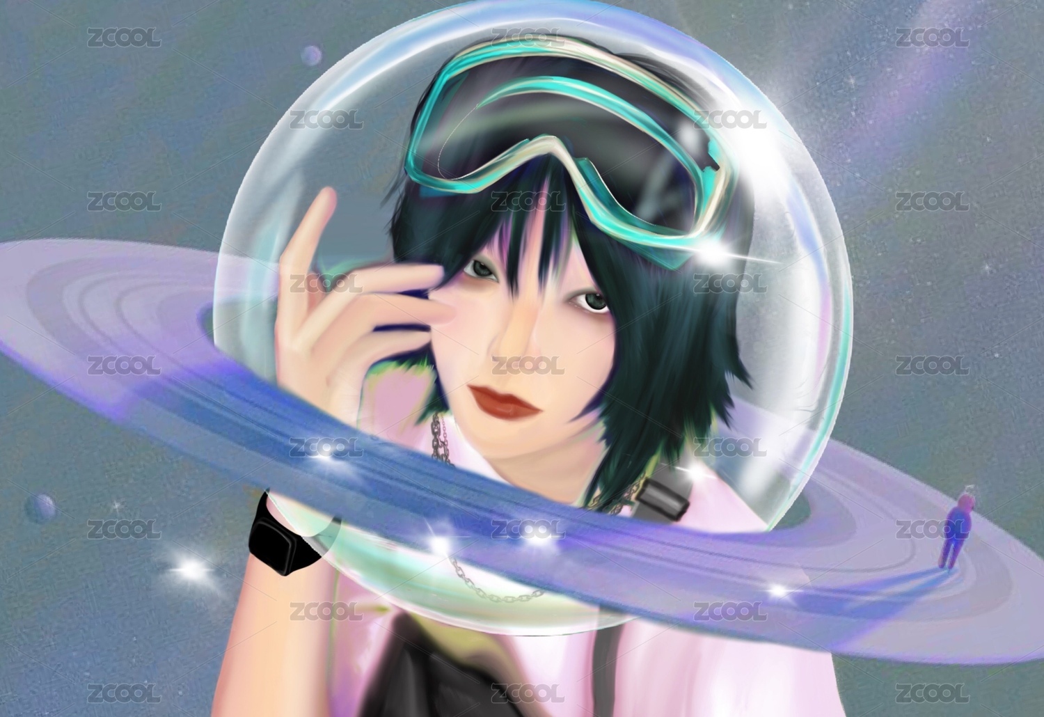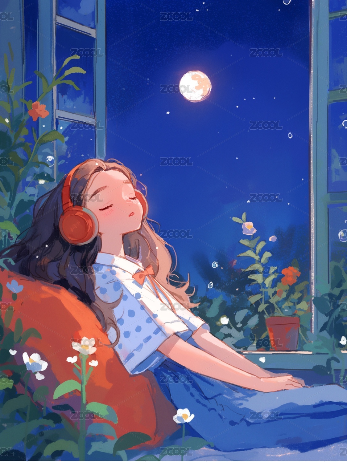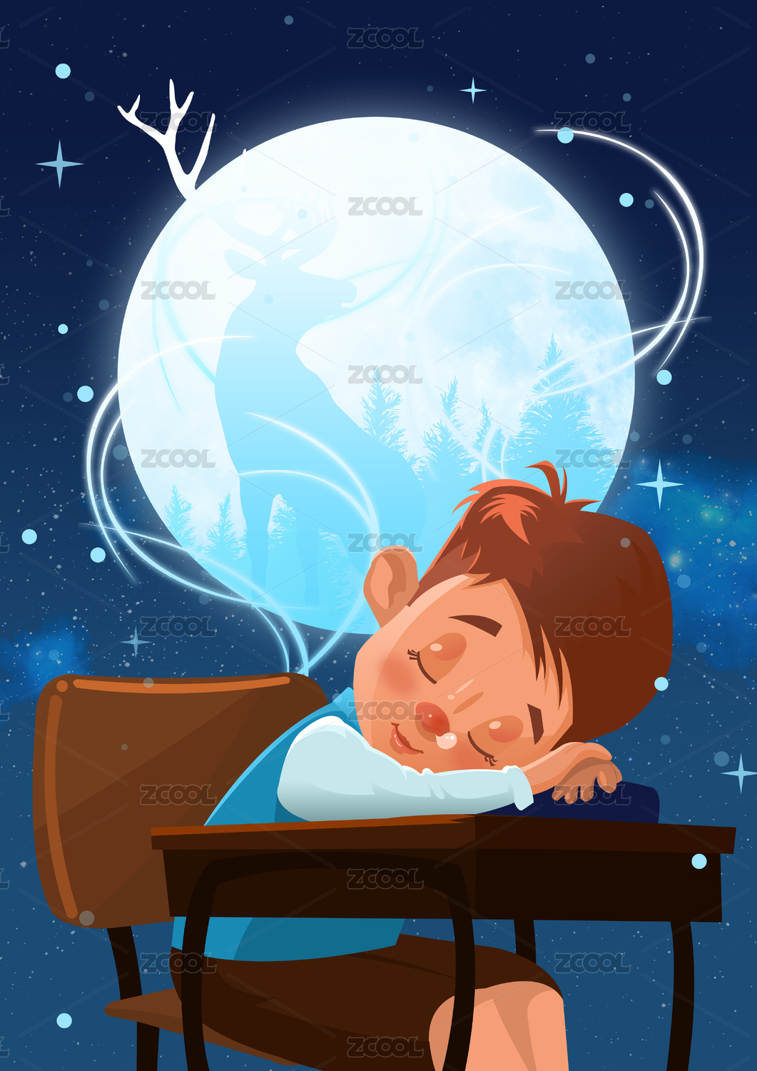 手绘卡通插画-在梦境里的城市间自由飞翔