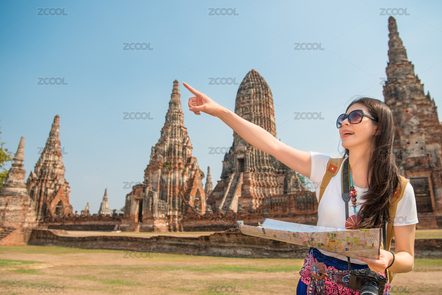 旅游观光女子拿着地图在围Chaiwatthanaram,大城府和前瞻性和指向的COPYSPACE在亚洲旅行在泰国微笑幸福的乐趣。