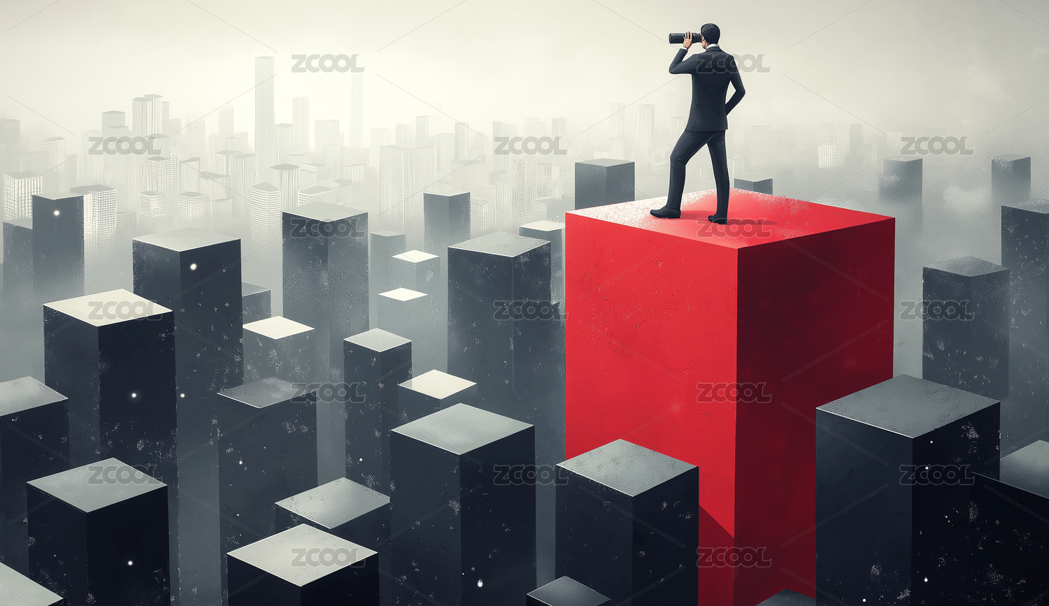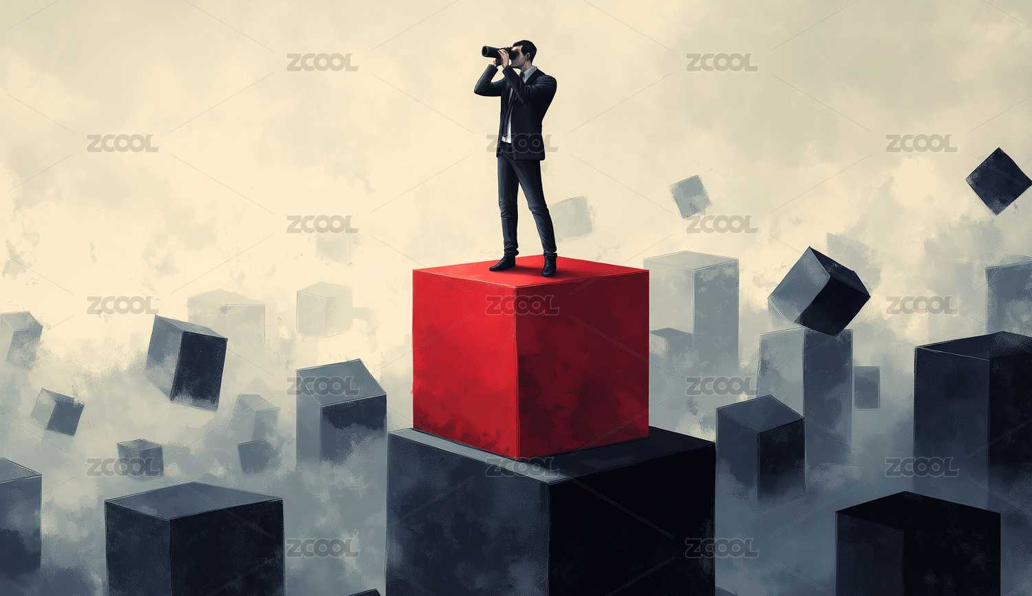 商务男站在红色立方体上拿着望远镜