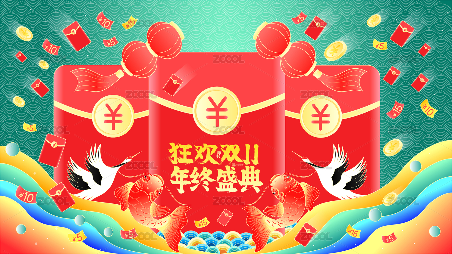 狂欢双十一年终盛典锦鲤仙鹤红包雨矢量插画