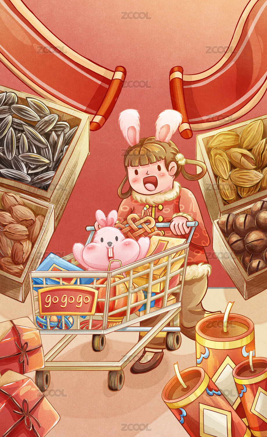 小女孩和小兔子买年货