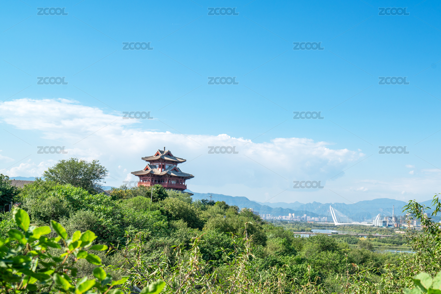 树林里的古建筑红色歇山式屋顶亭榭楼台