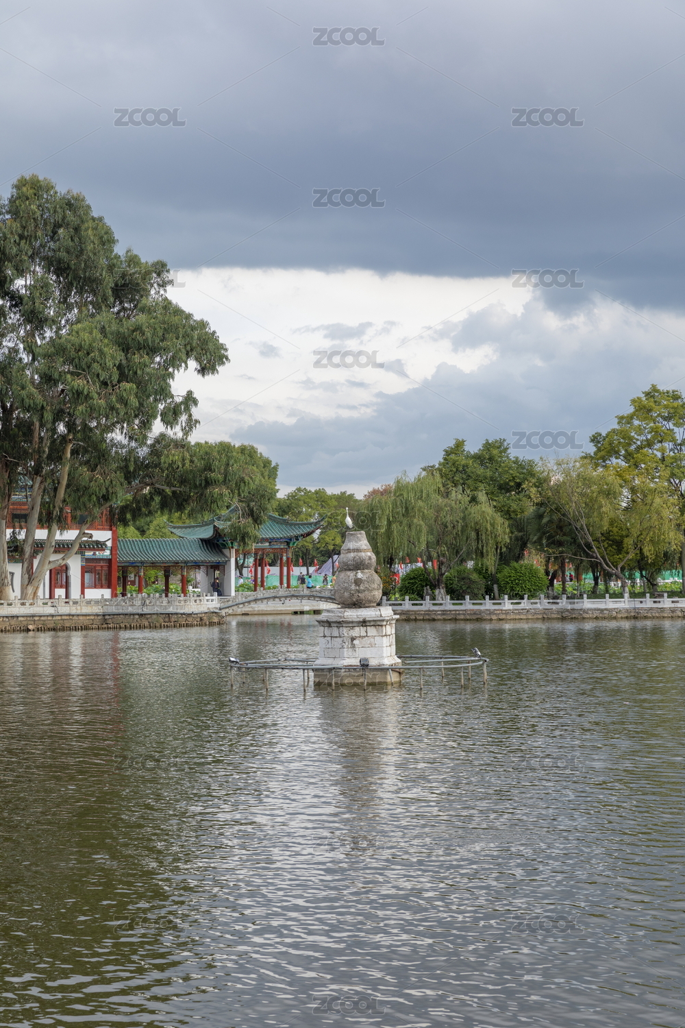 中国湖南长沙岳麓山上楼台倒影入荷塘