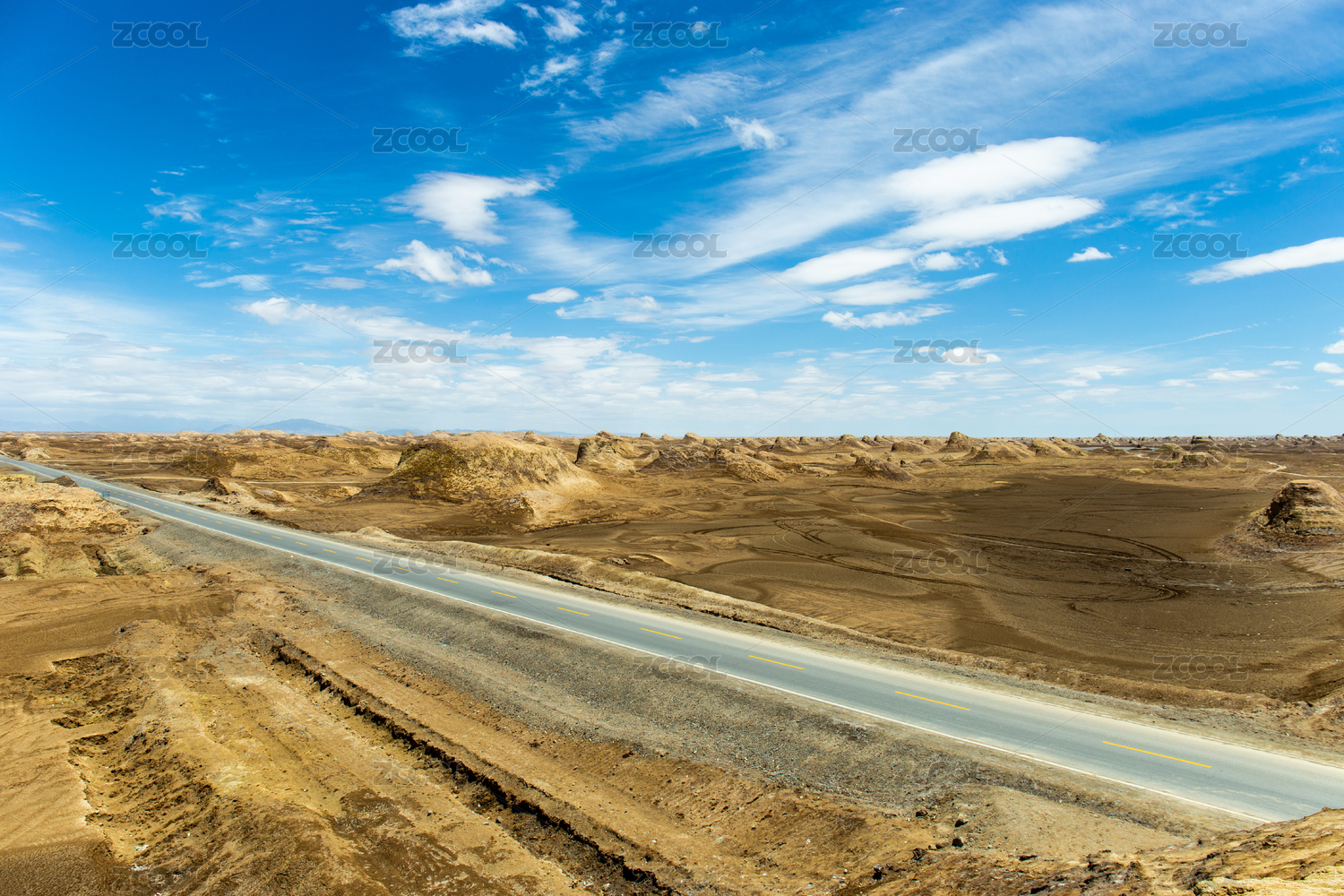中国西北无人无的广阔戈壁滩和笔直的道路