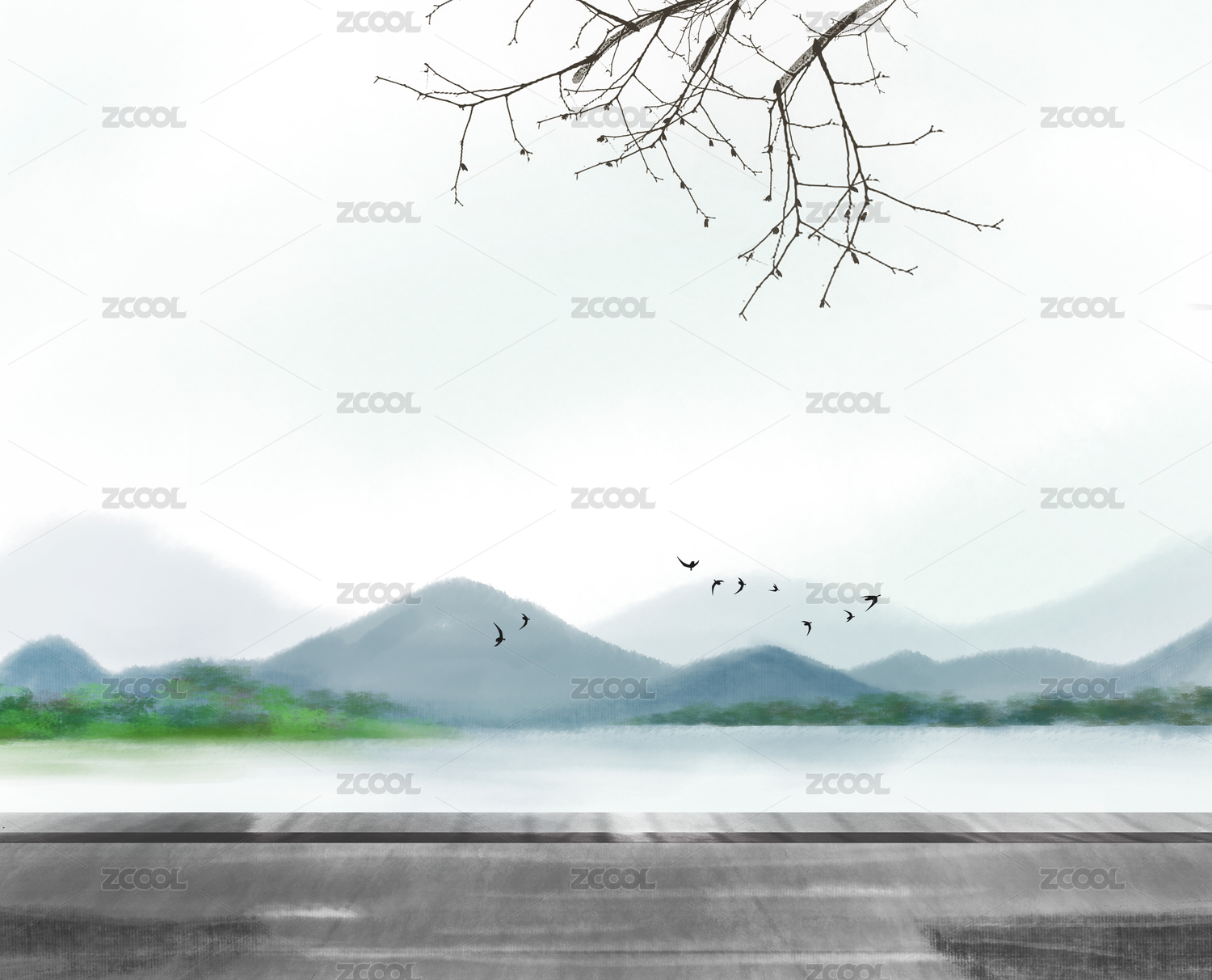 有远山水面天空飞过几只飞鸟中国风手绘插画