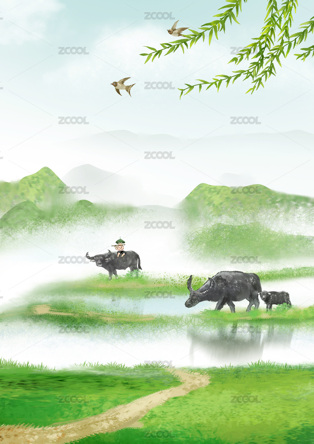 中国风手绘水墨牛绿色山水节气插画