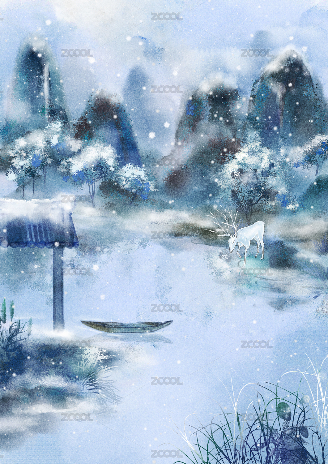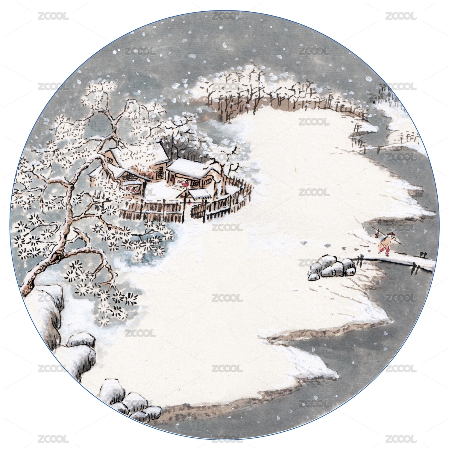中国风手绘二十四节气插画冬日大雪 水墨山水画