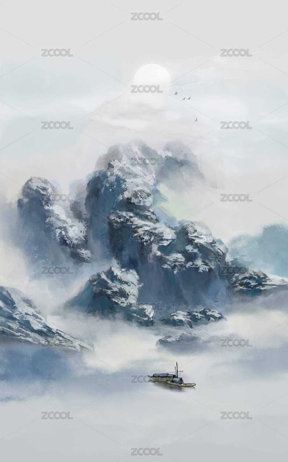 中国风手绘水墨山水画背景油画意境风景插画