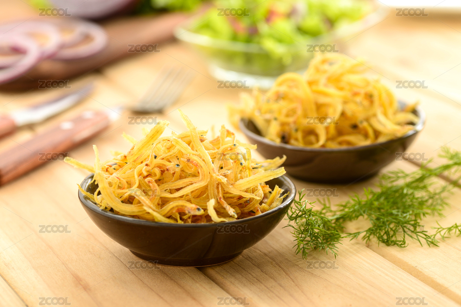 木头桌面上盘子里的黄色小银鱼干