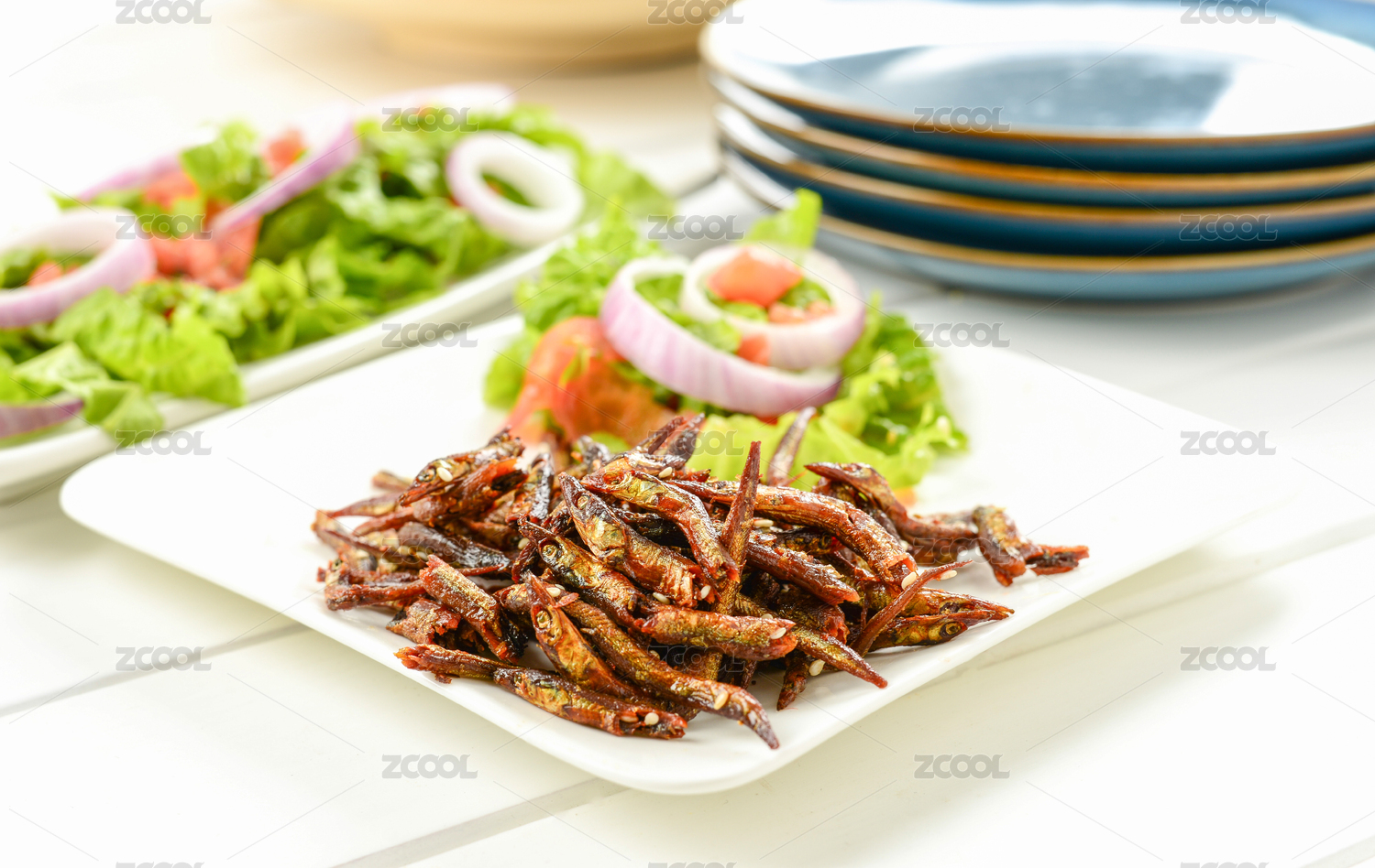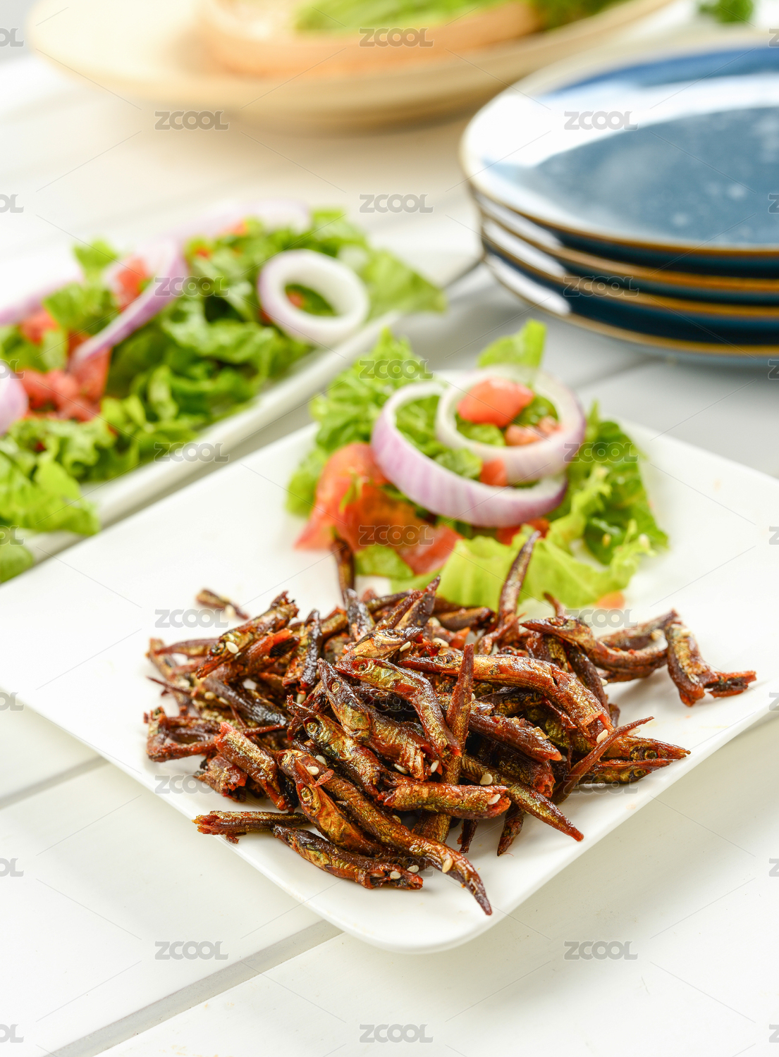 白色木板上盘子里的干海鲜银鱼干