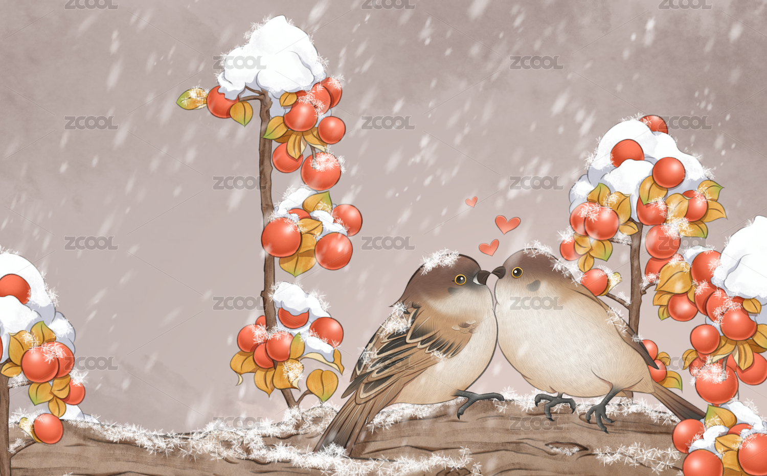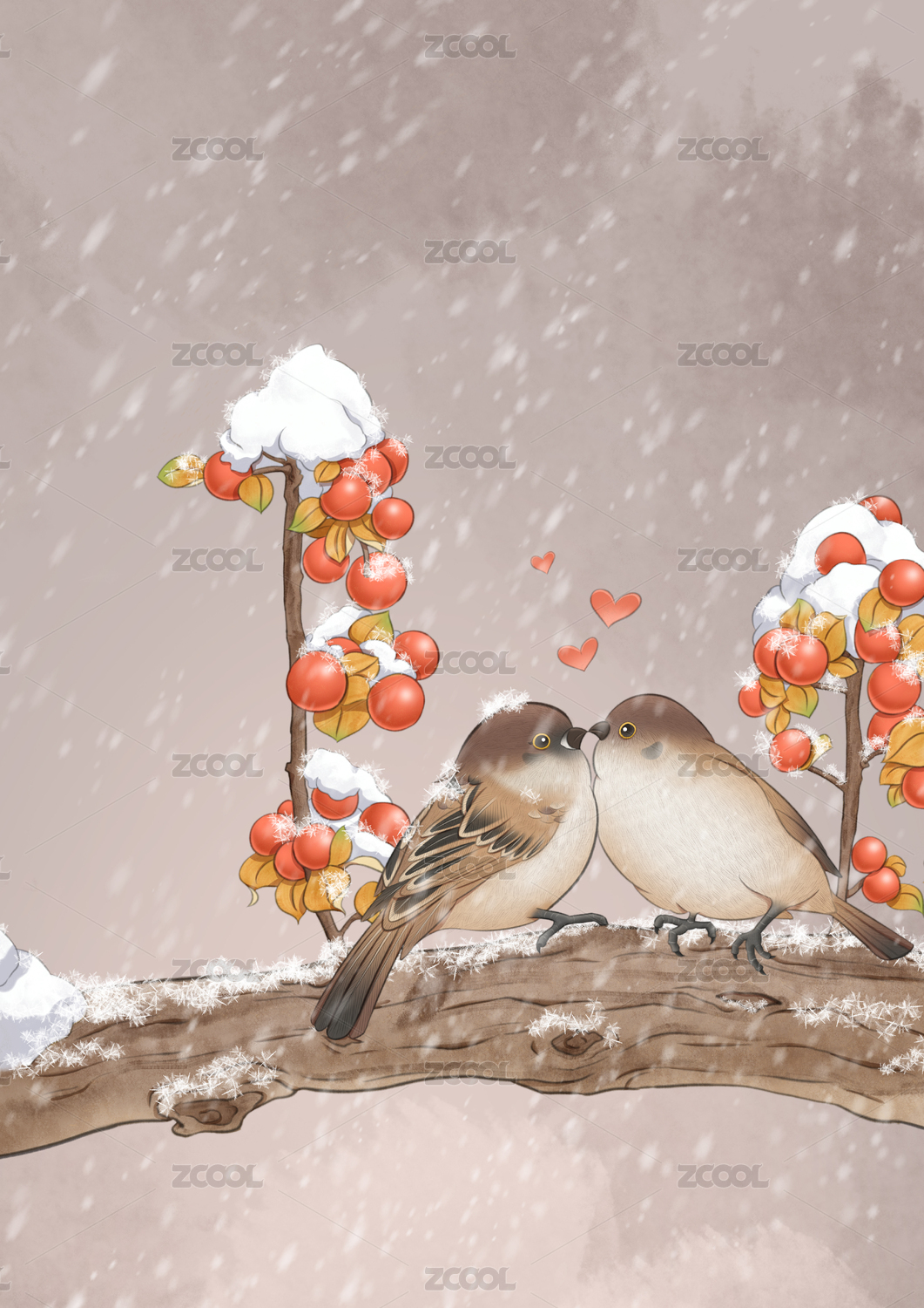 冬天树枝上停着两只小鸟