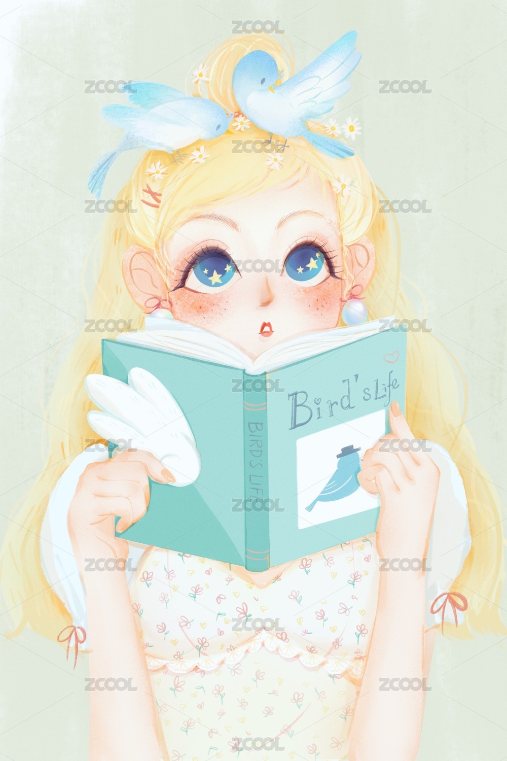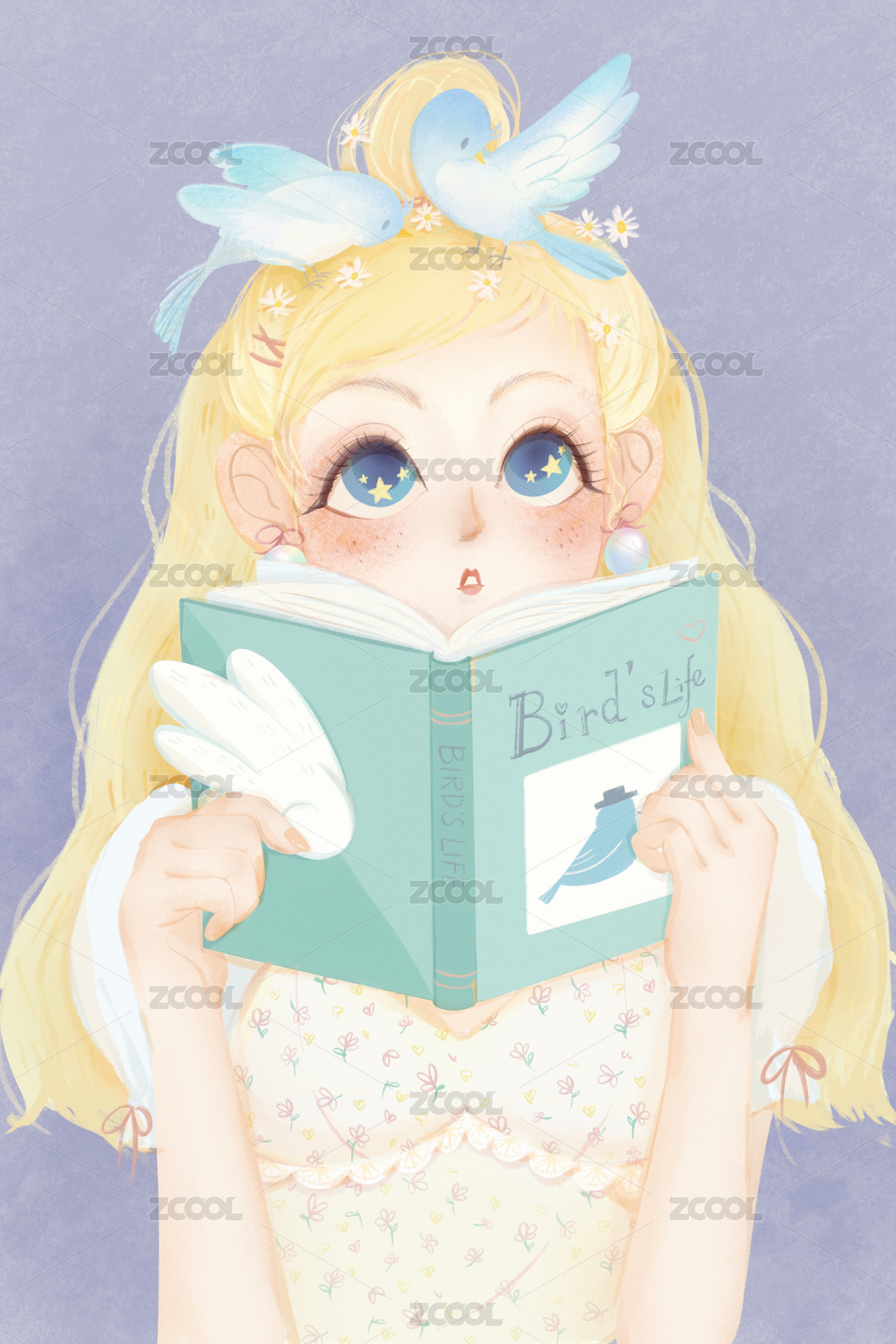 头顶两只小鸟的少女半身像插画