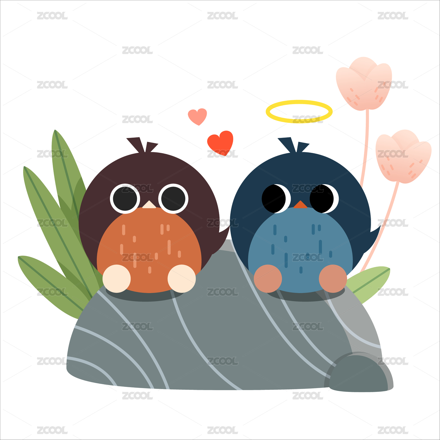石头上恋爱中的两只小鸟 矢量插画