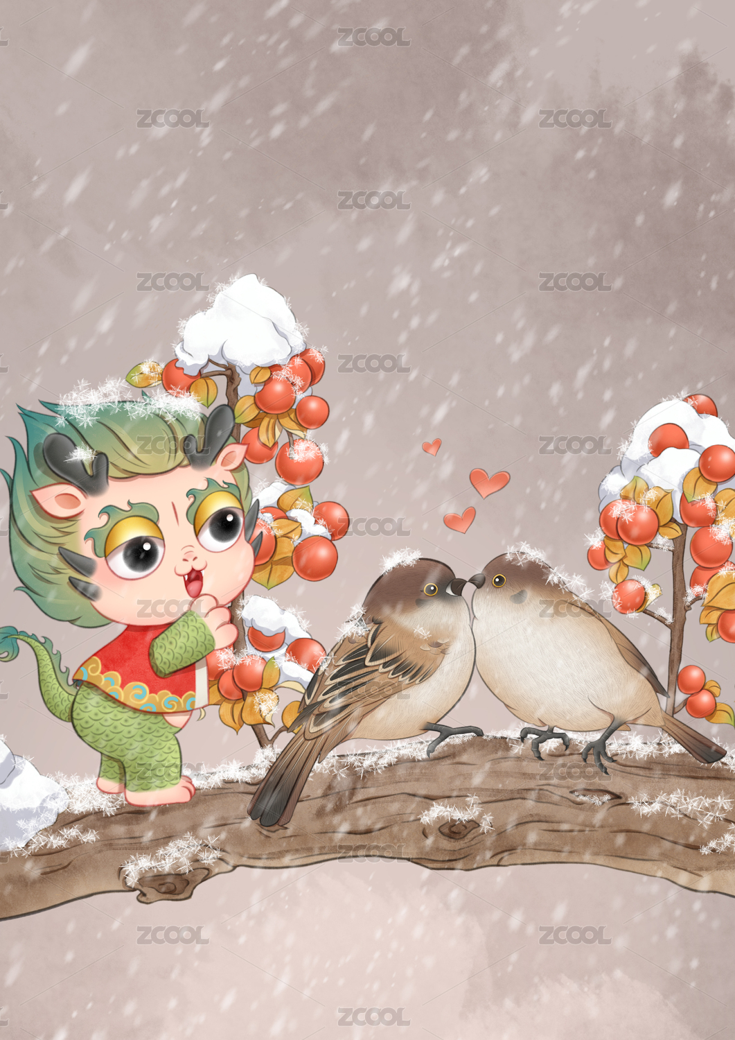 立冬龙宝躲在树枝后看两只小鸟秀恩爱