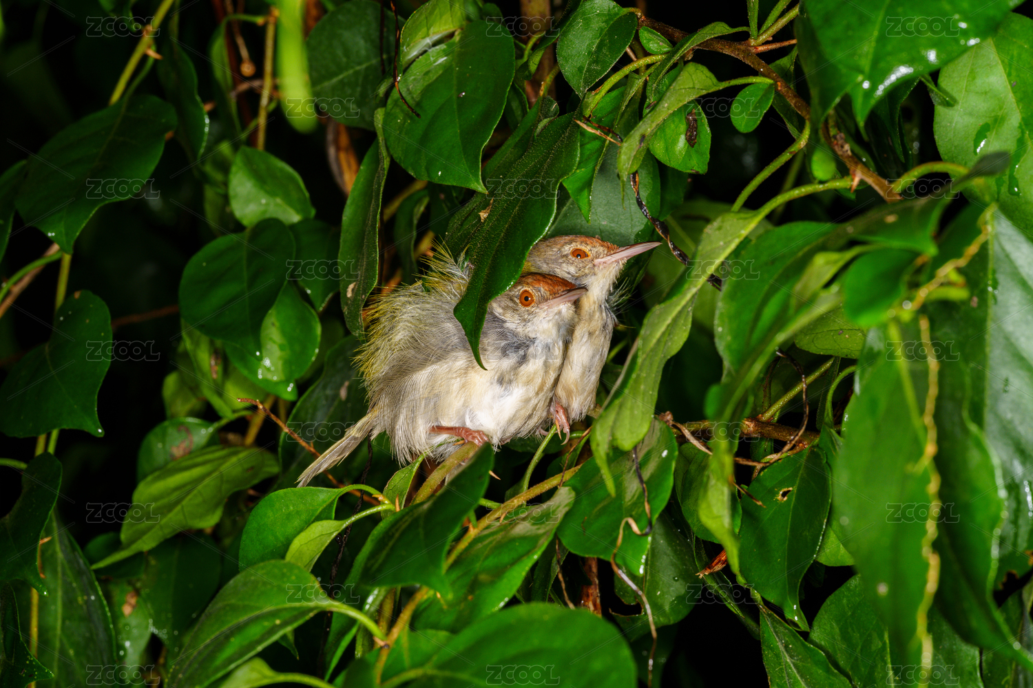 绿叶丛中的两只小鸟