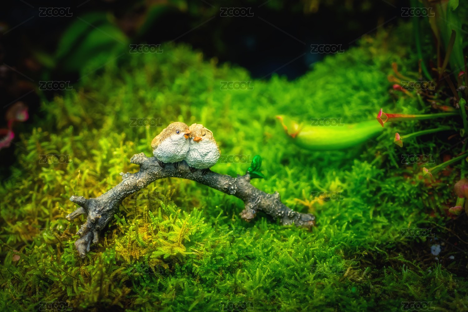 草地上两只小鸟摆件场景温馨