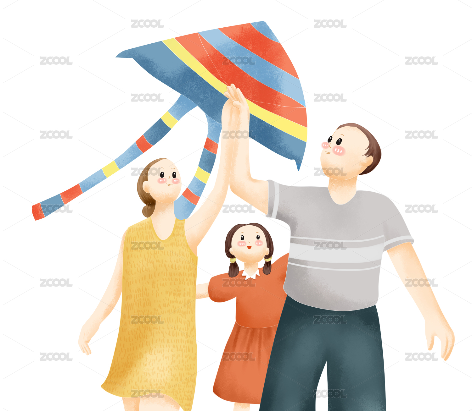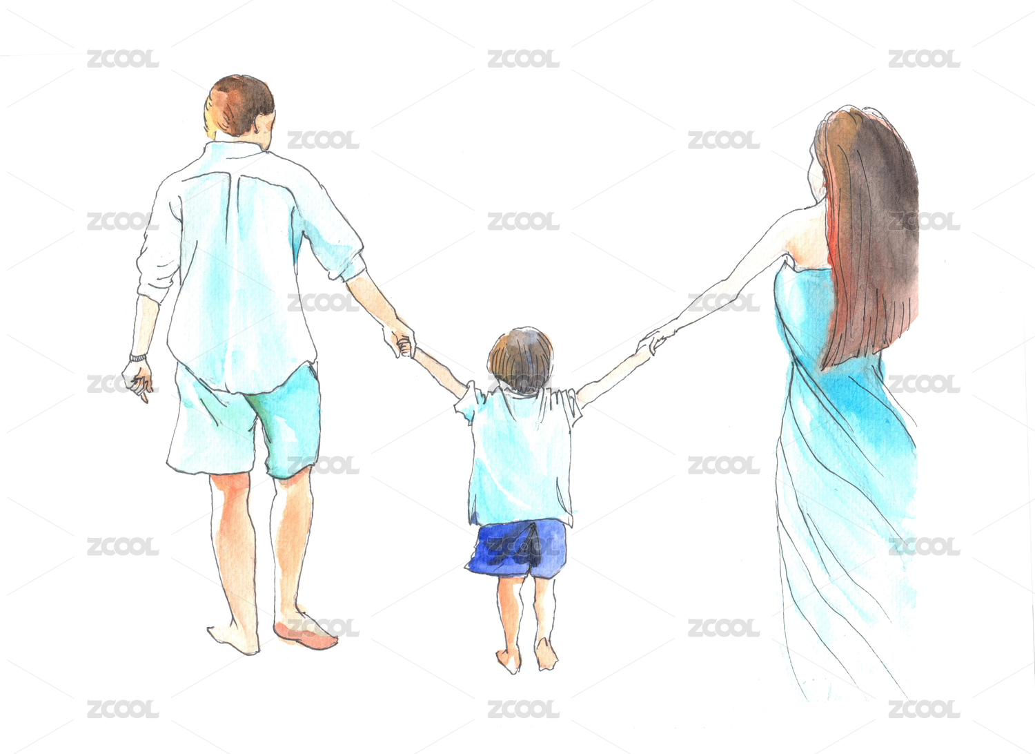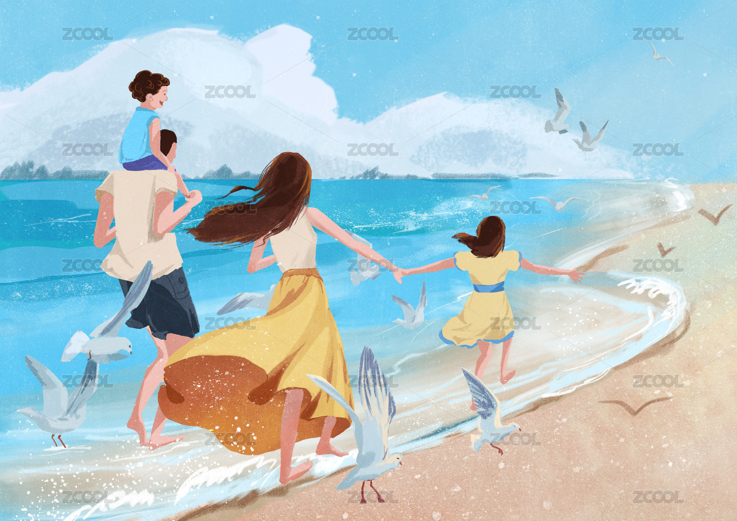 一家四口家庭亲情海边插画