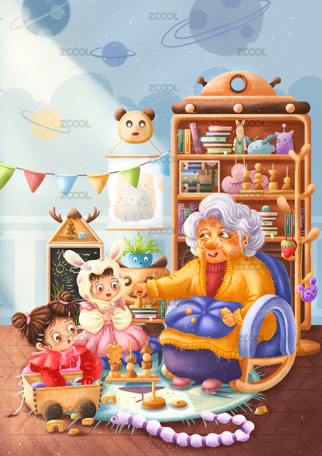 室内奶奶给女孩讲故事温馨亲情