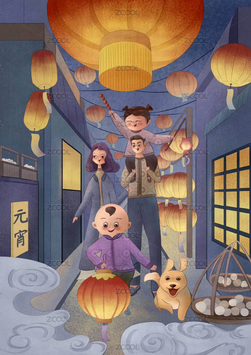 一家人元宵节出门看灯年俗插画