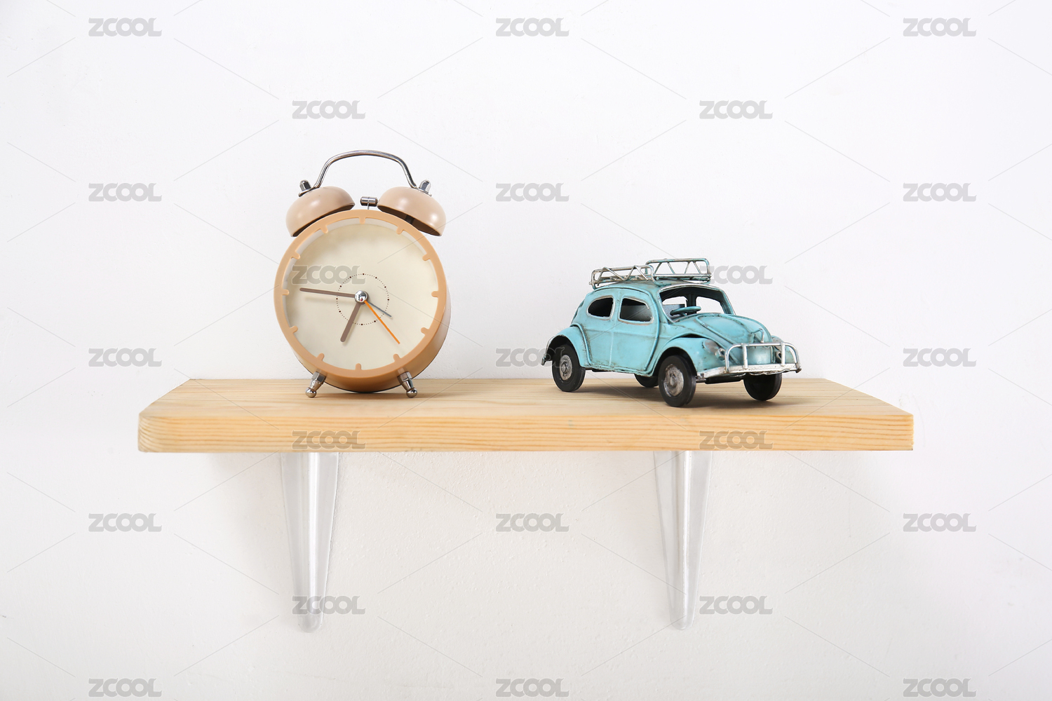 放有闹钟和玩具车的木板置物架装饰在墙上