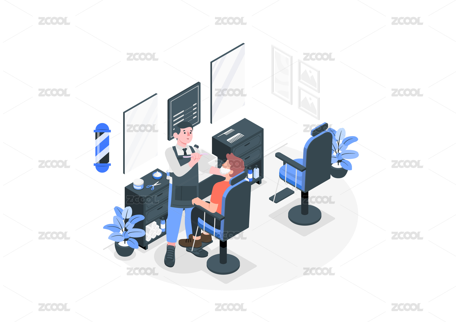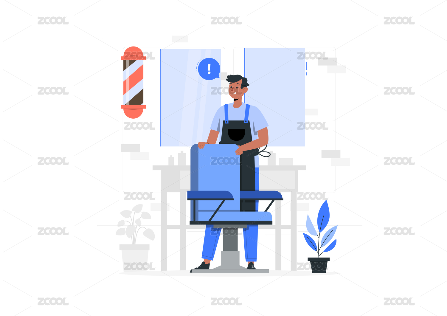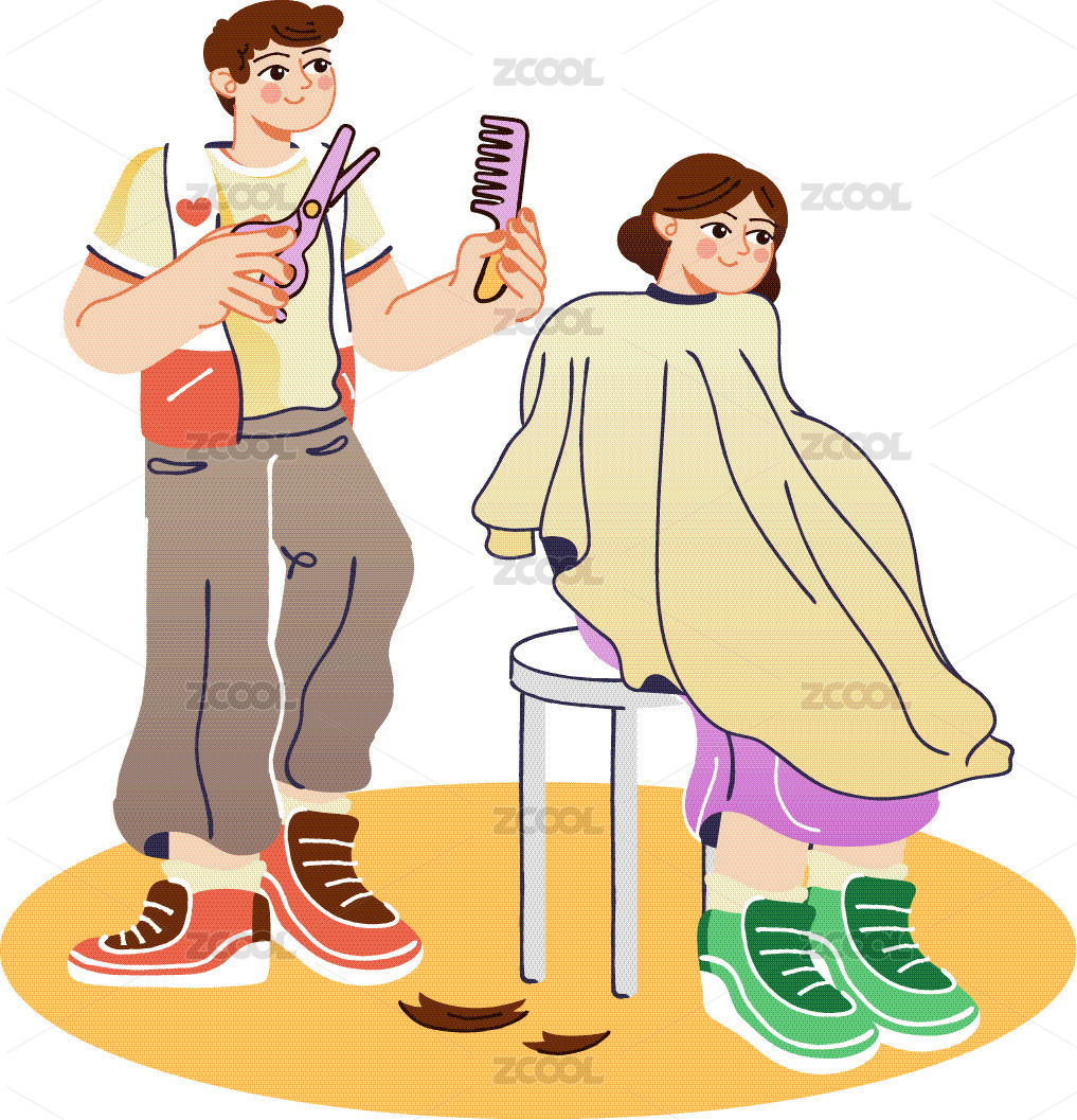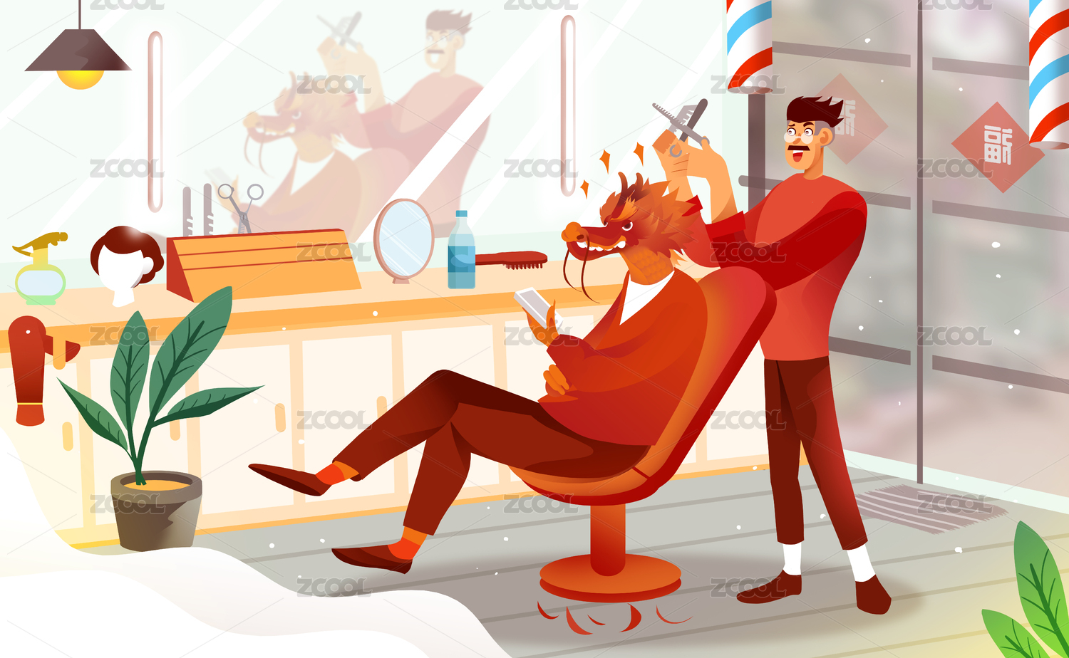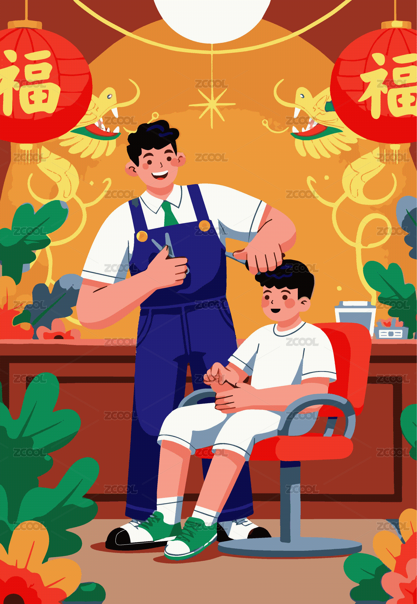 扁平风格插画二月龙抬头民俗文化理发师剪发