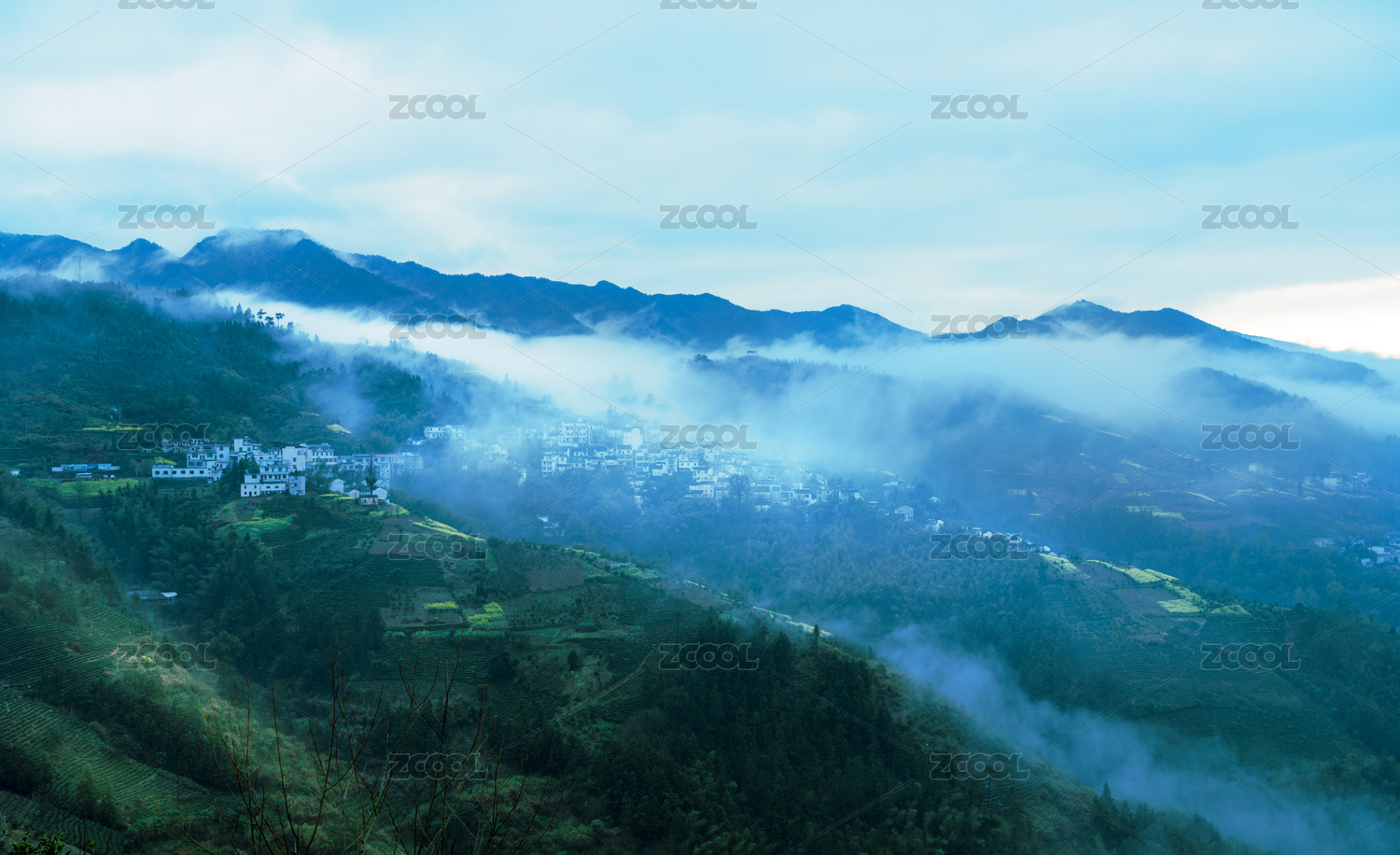 白墙灰瓦的乡村民居被云雾环绕