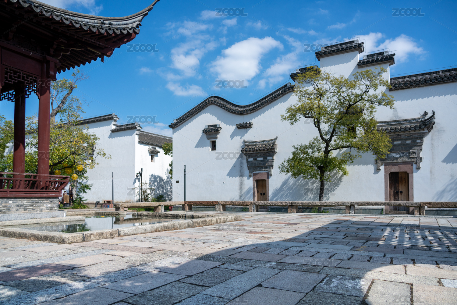 白墙灰瓦徽派建筑和红色柏油地面