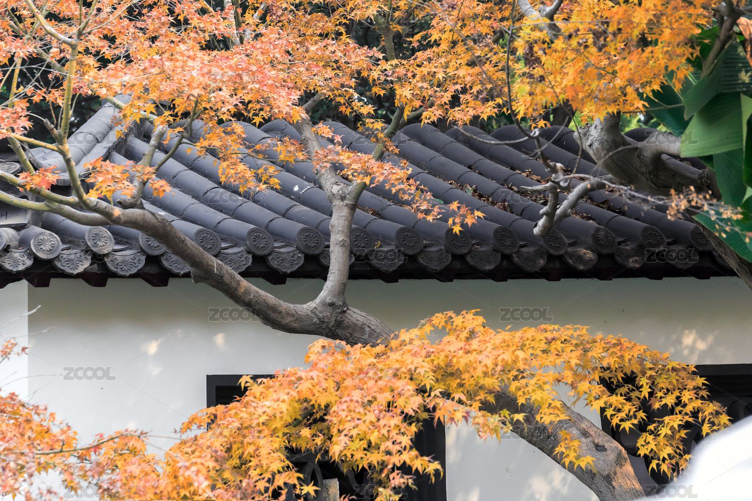 秋天白墙灰瓦古建筑前的黄枫树