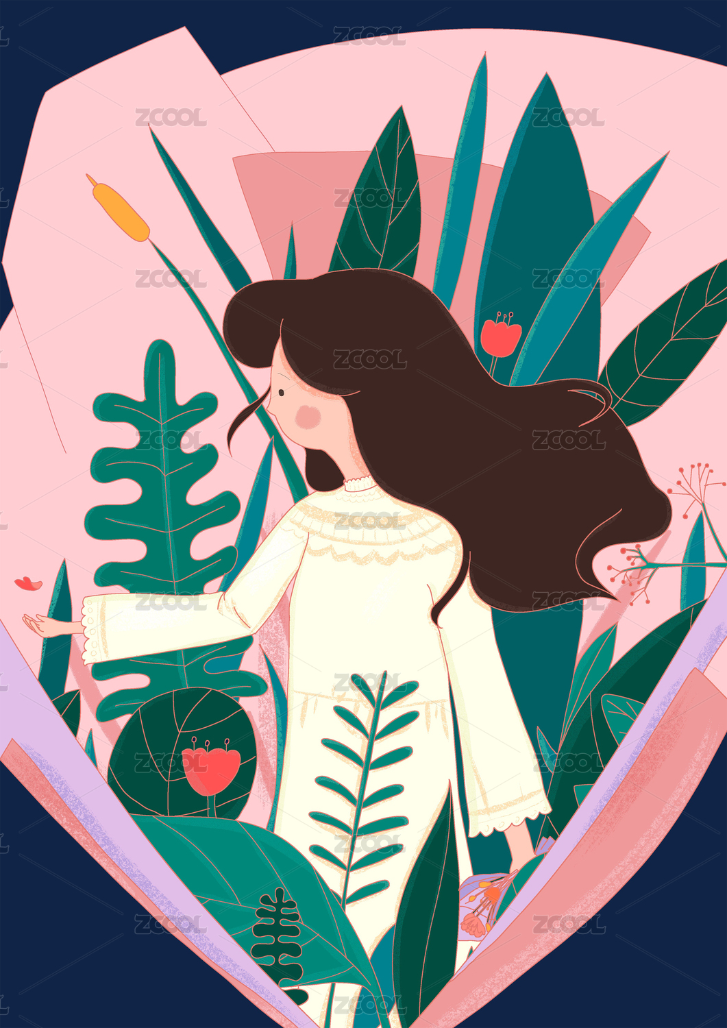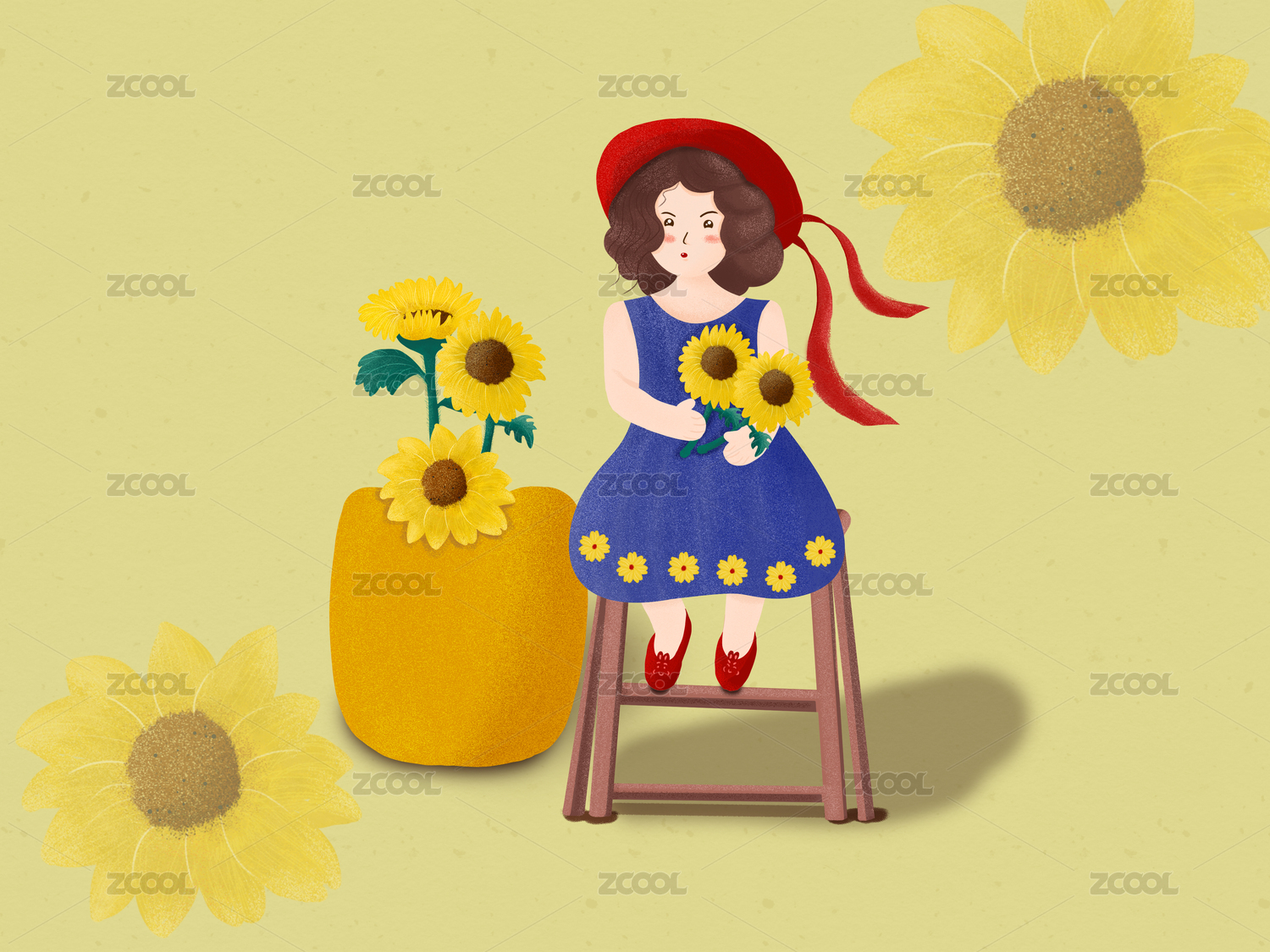 手绘插画向日葵女孩