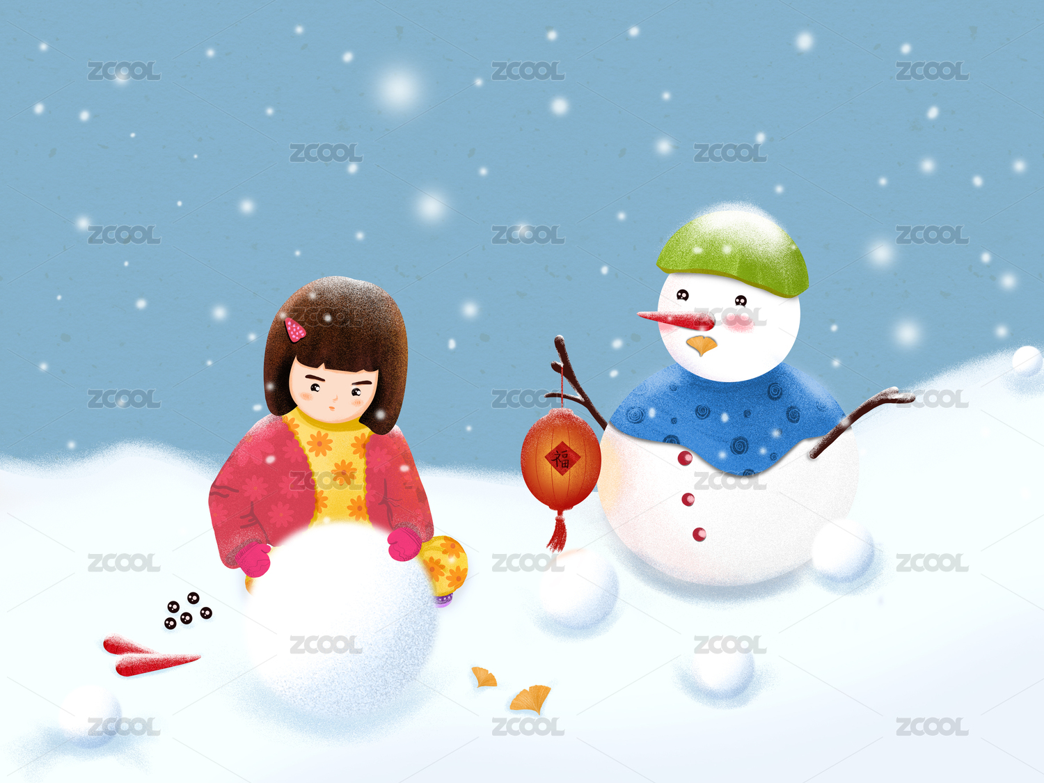 手绘插画堆雪人的小女孩