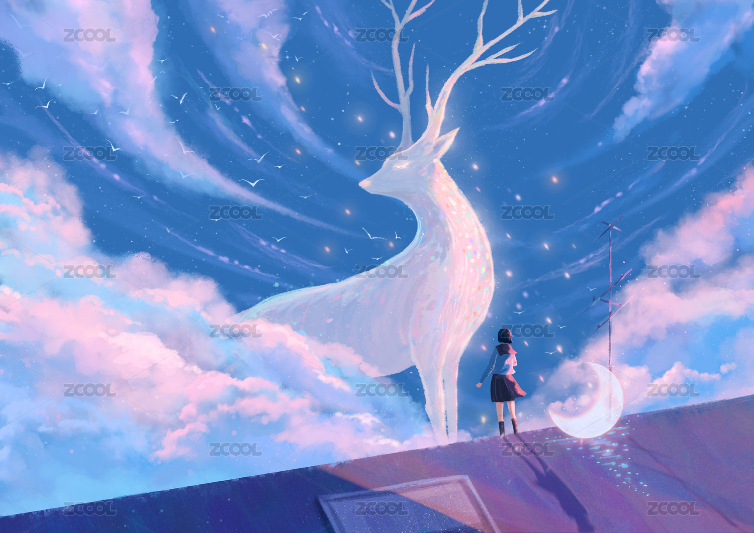 女孩背影站在屋顶遇见麋鹿