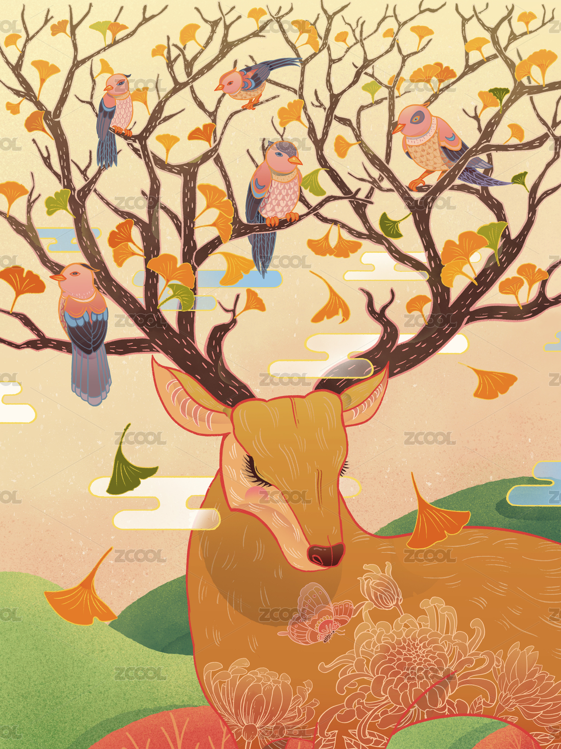 中国风国潮秋天的麋鹿节气插画
