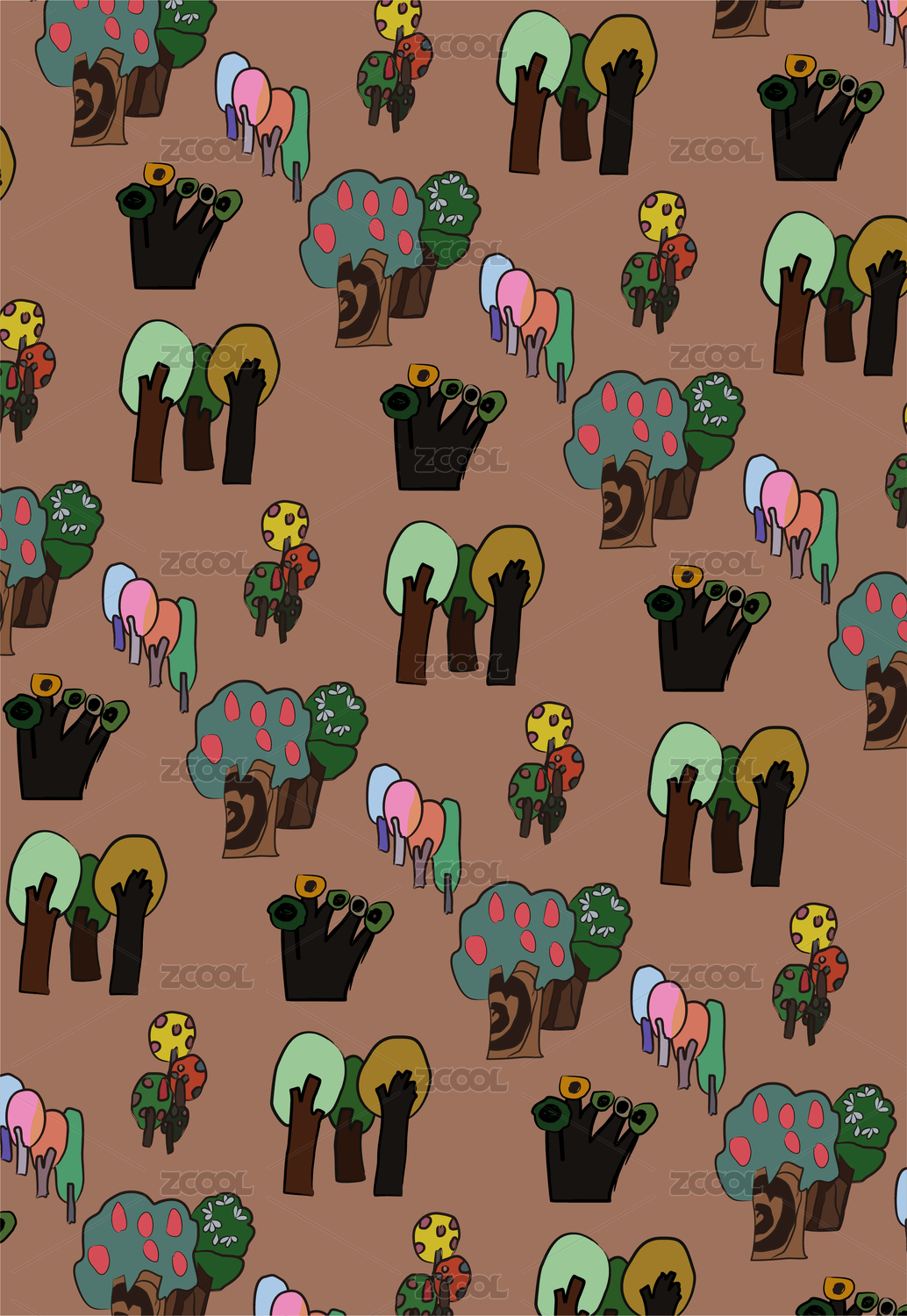时尚可爱卡通树满版印花四方连续矢量图