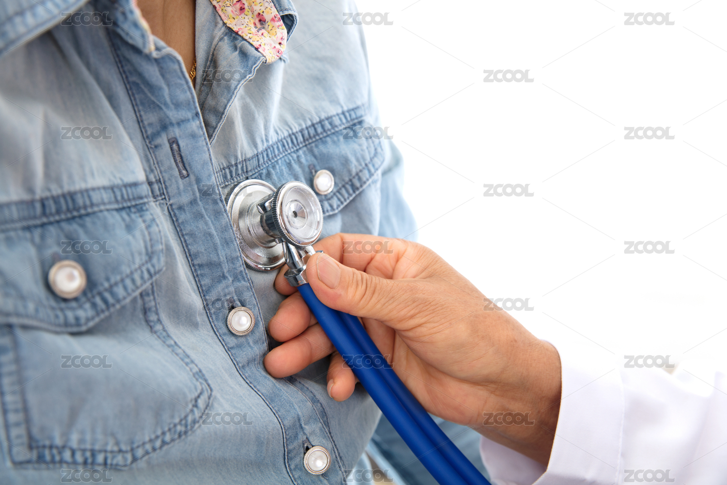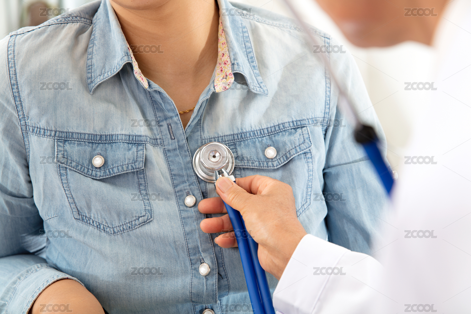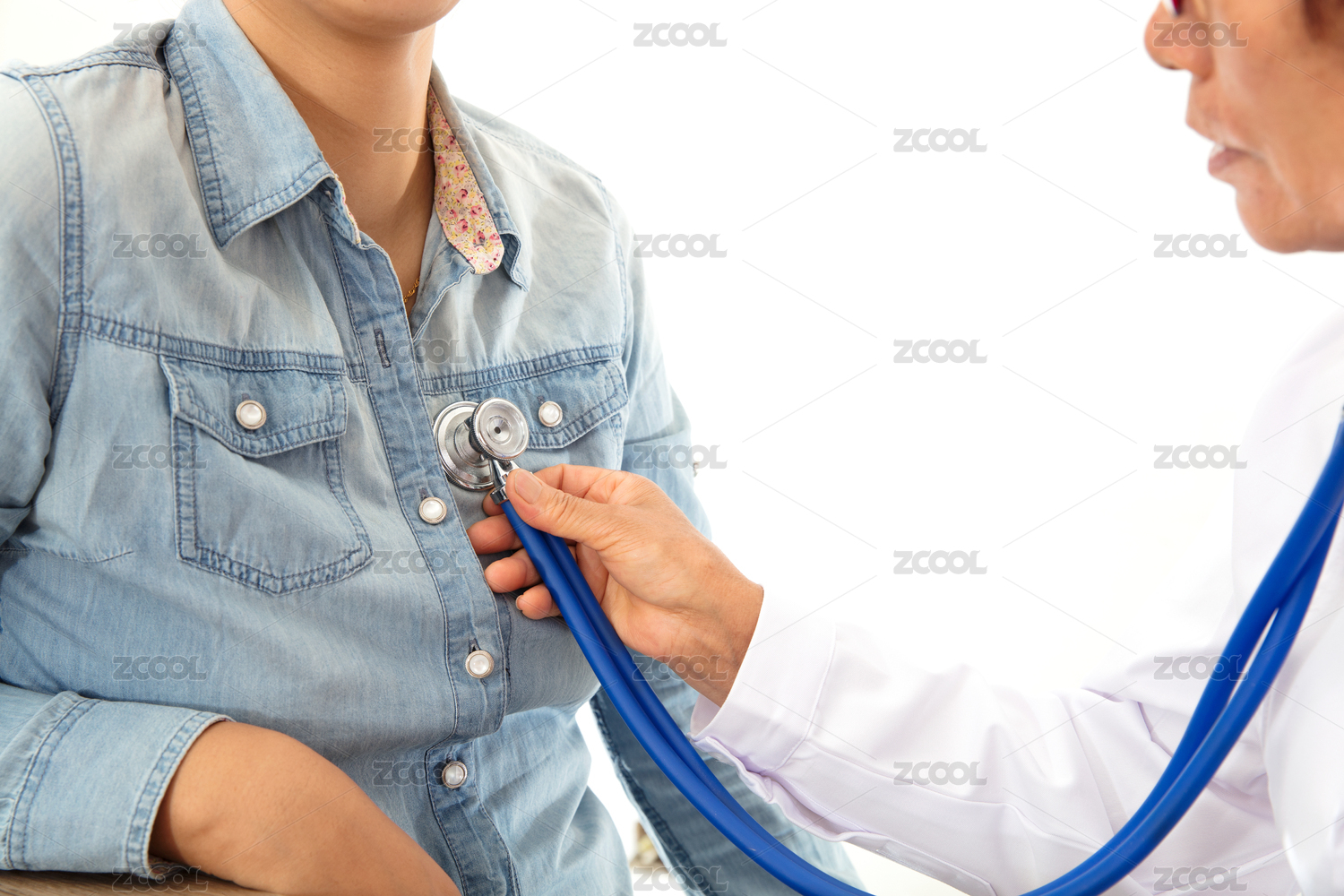 穿着白大褂的中国医生正用听诊器为患者听心率