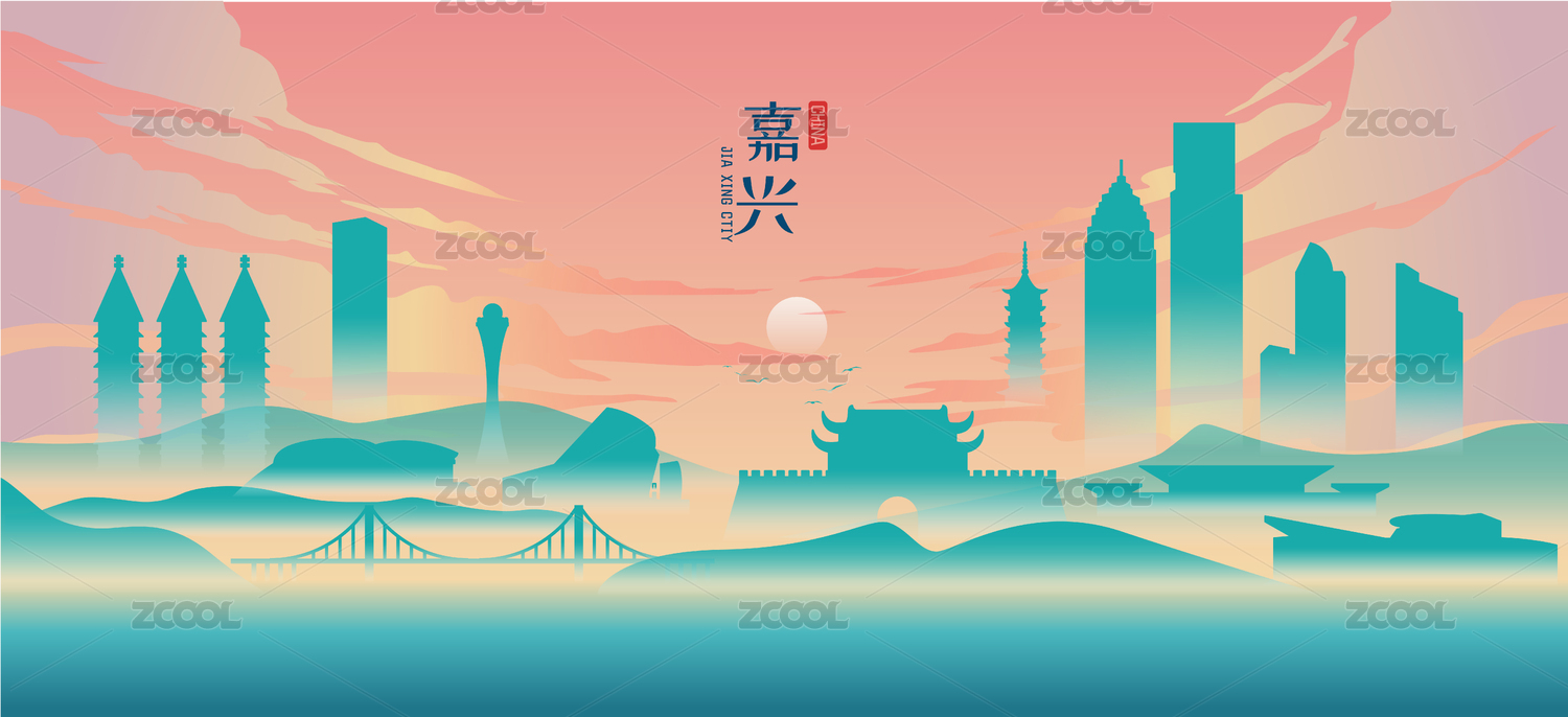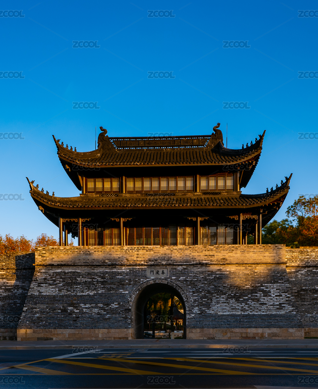 中国浙江嘉兴南湖革命纪念馆霞光照射