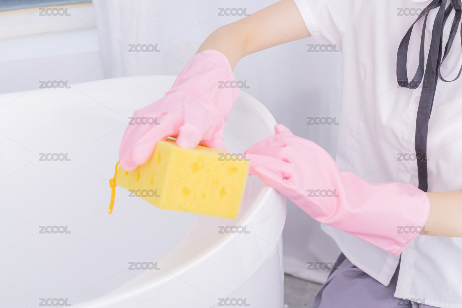东方女性学生带着手套清洁浴缸 打扫室内卫