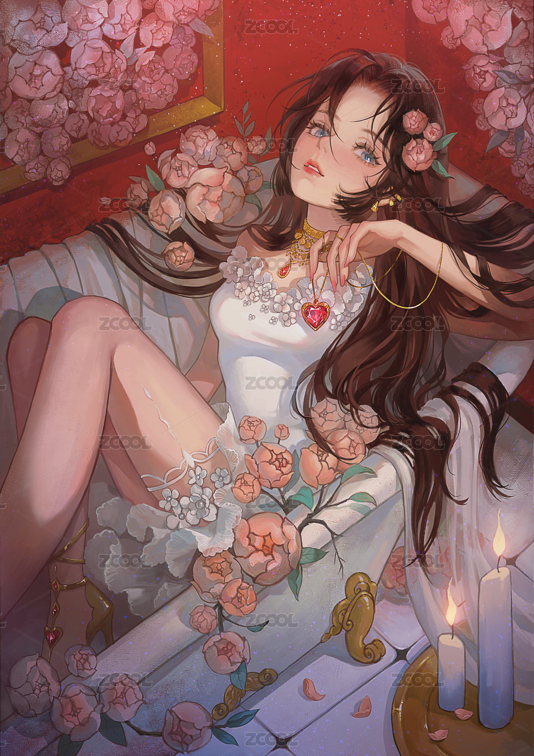 穿着纱裙的长发美女躺在浴缸和花丛里