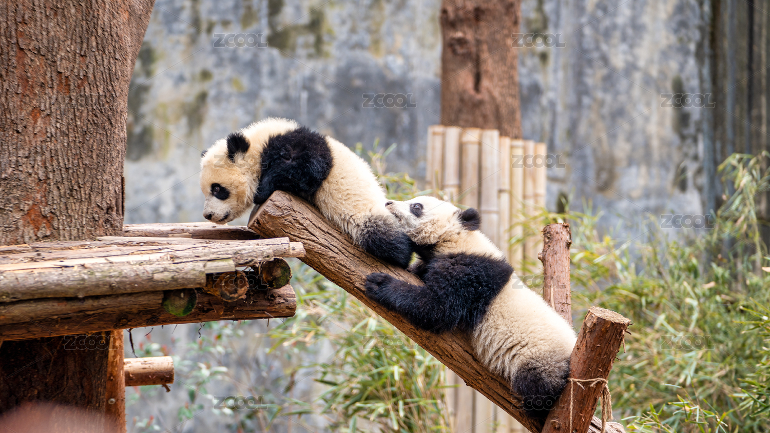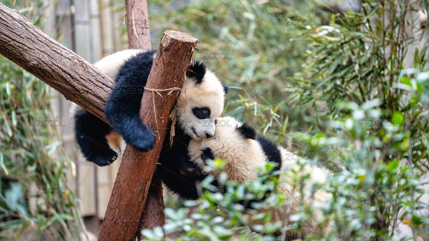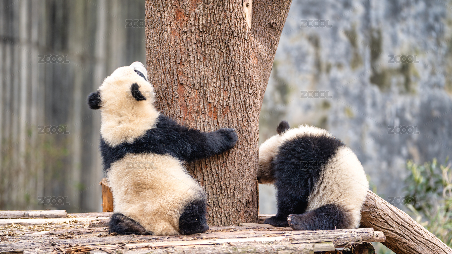 成都大熊猫繁育研究基地两只大熊猫幼崽玩耍