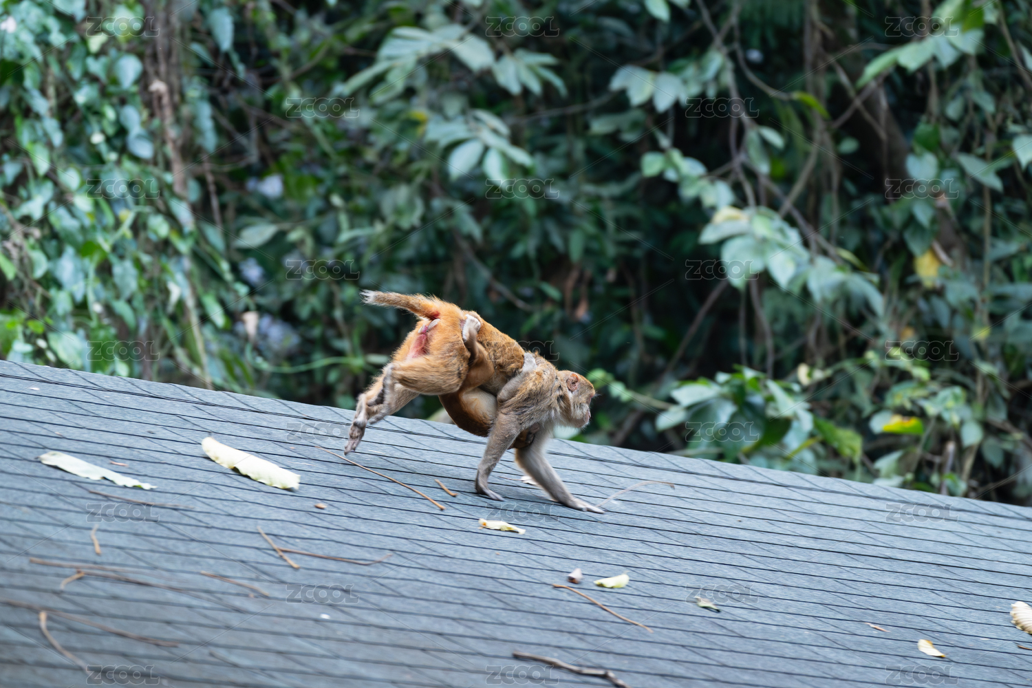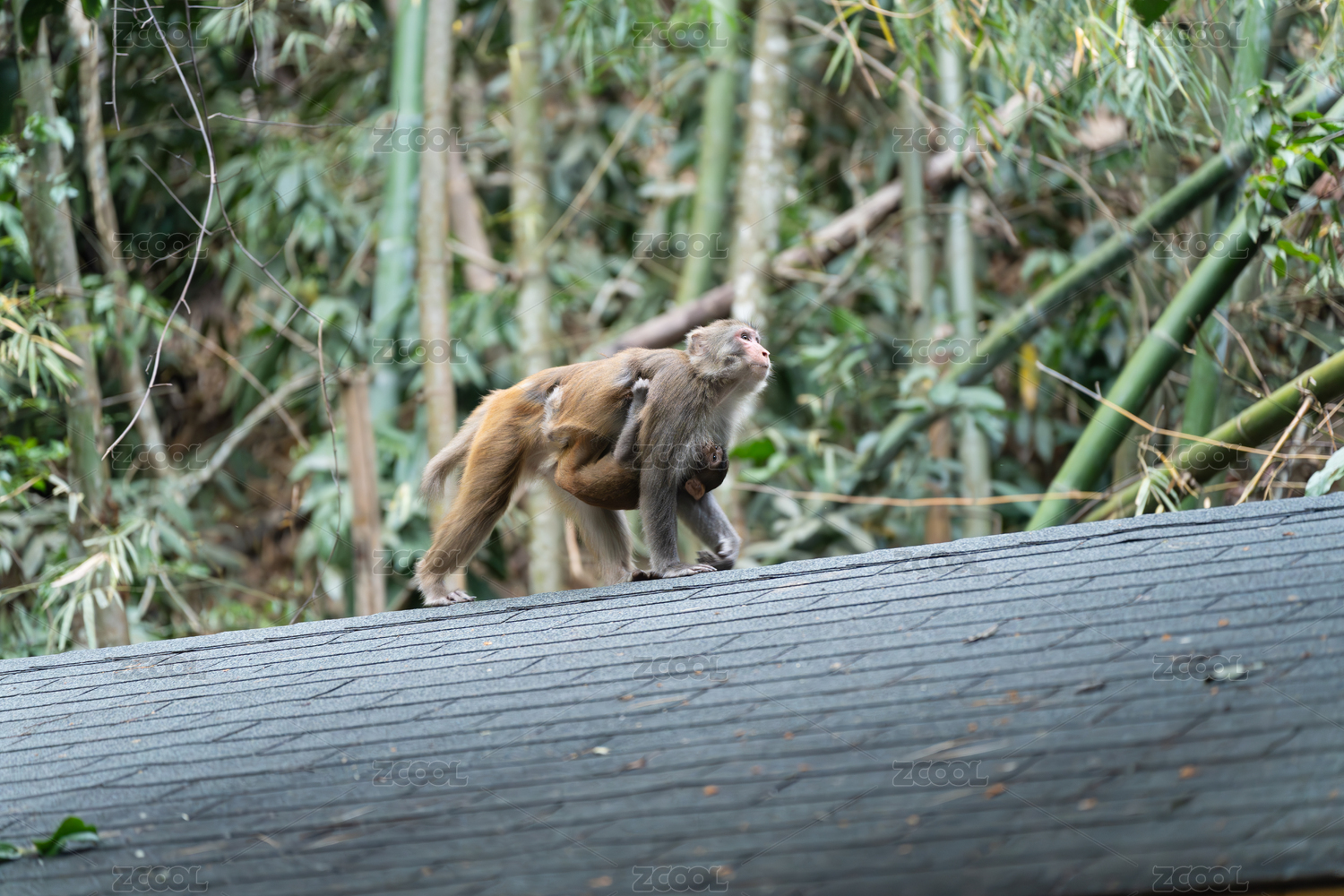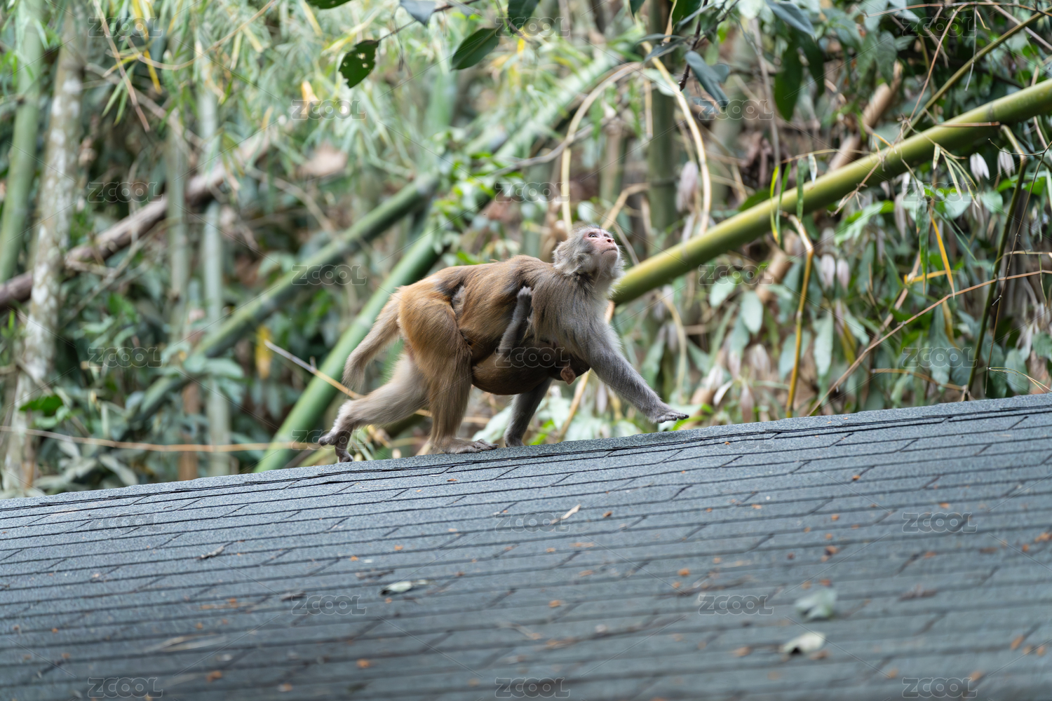 屋顶上背负幼崽的猴子