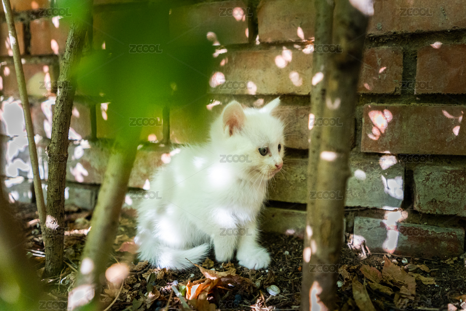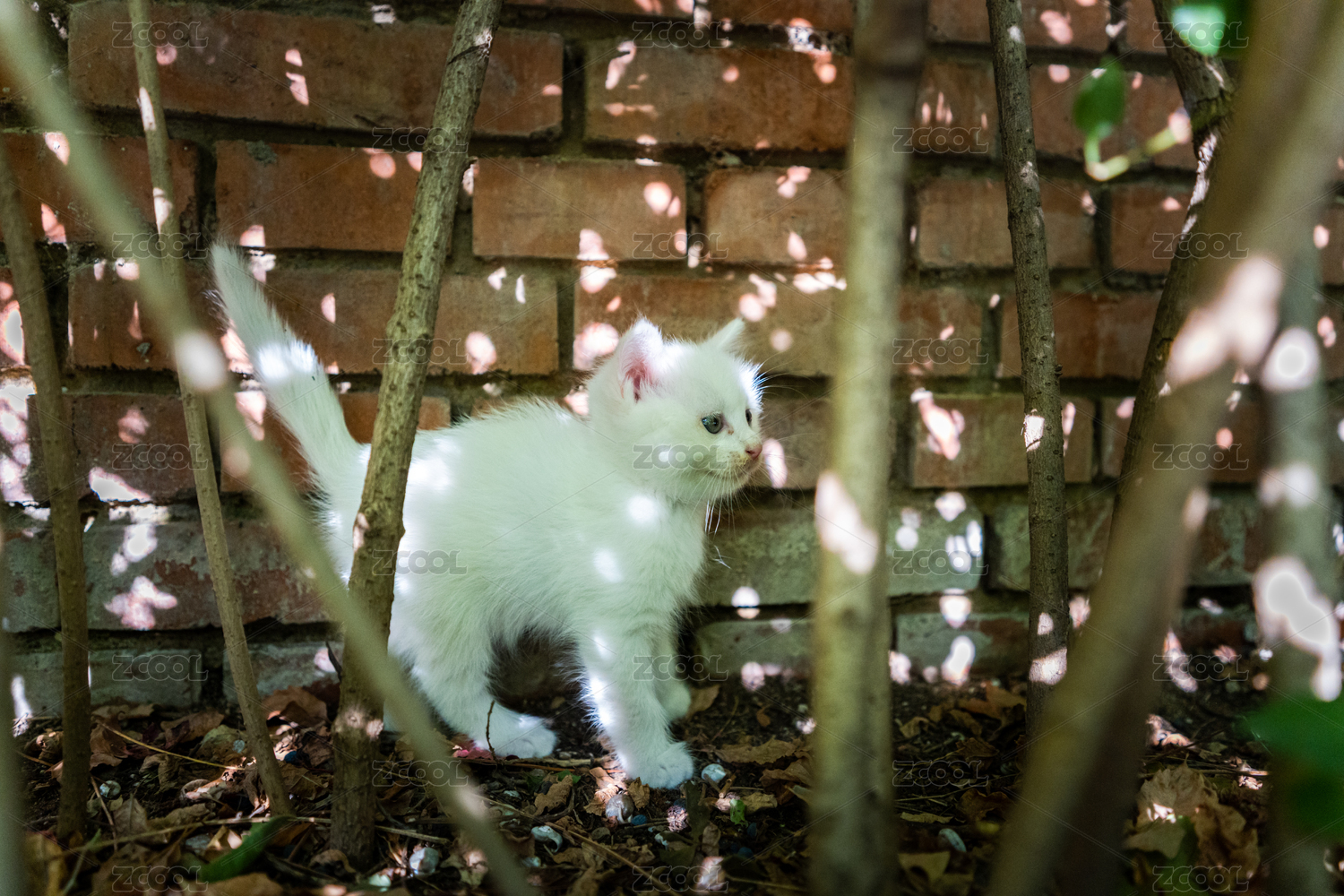 小白猫幼崽在小树林的特写镜头