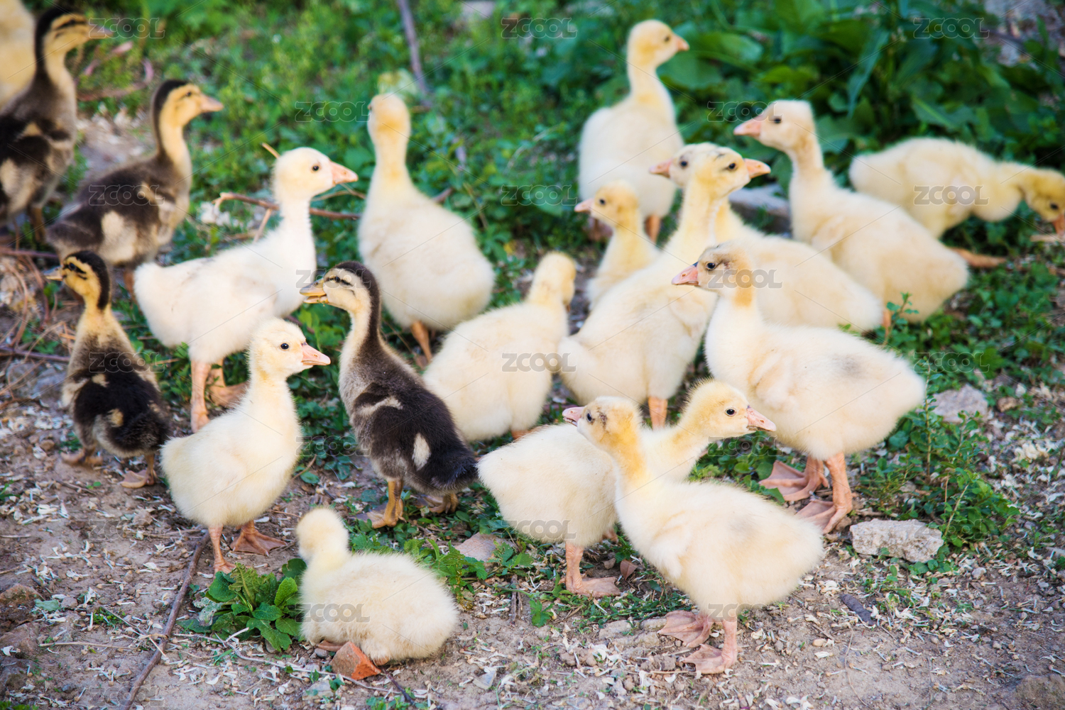 一群白鹅的幼崽在一起觅食