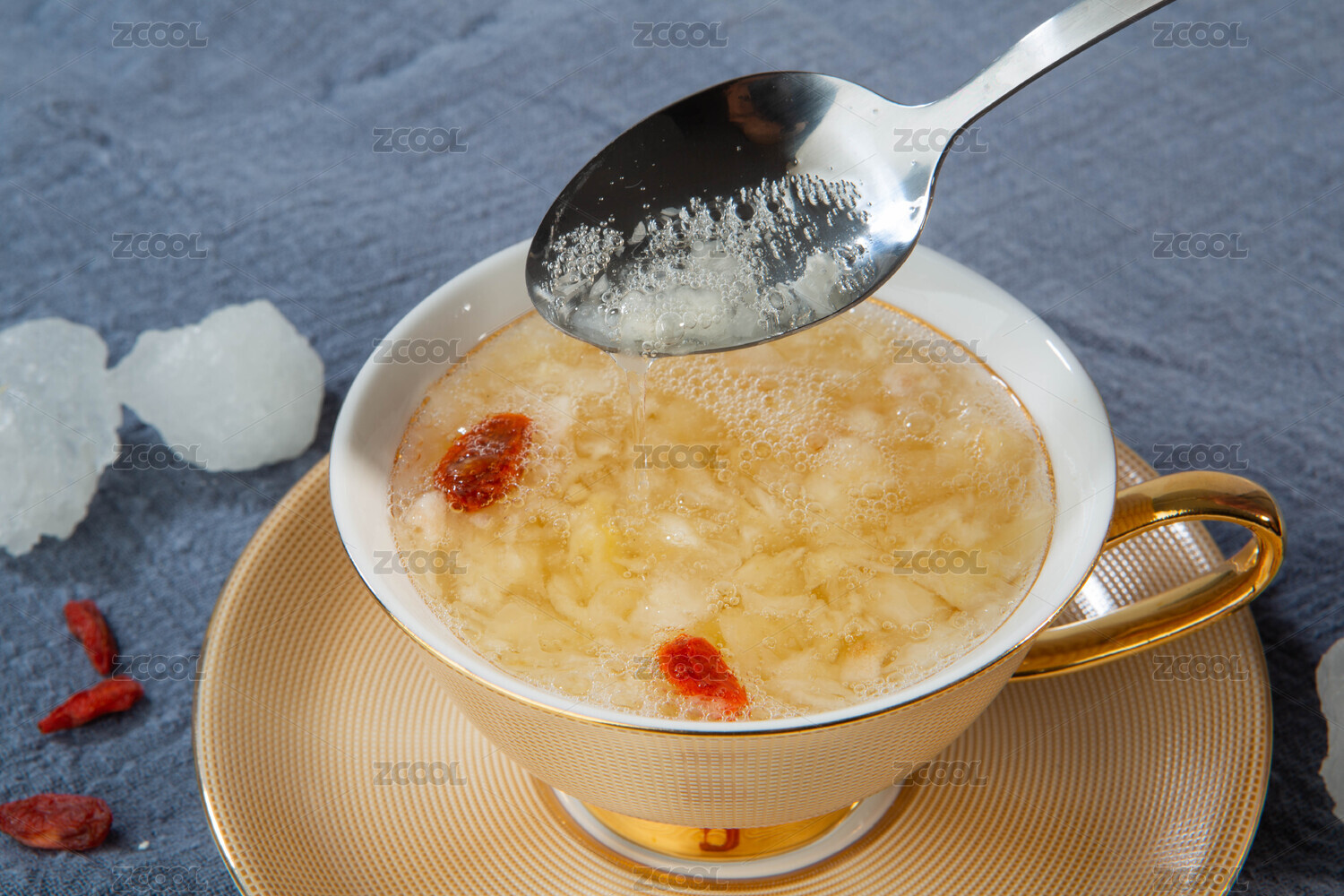 铁锅煲里的木勺装着的黄金板栗鸡汤