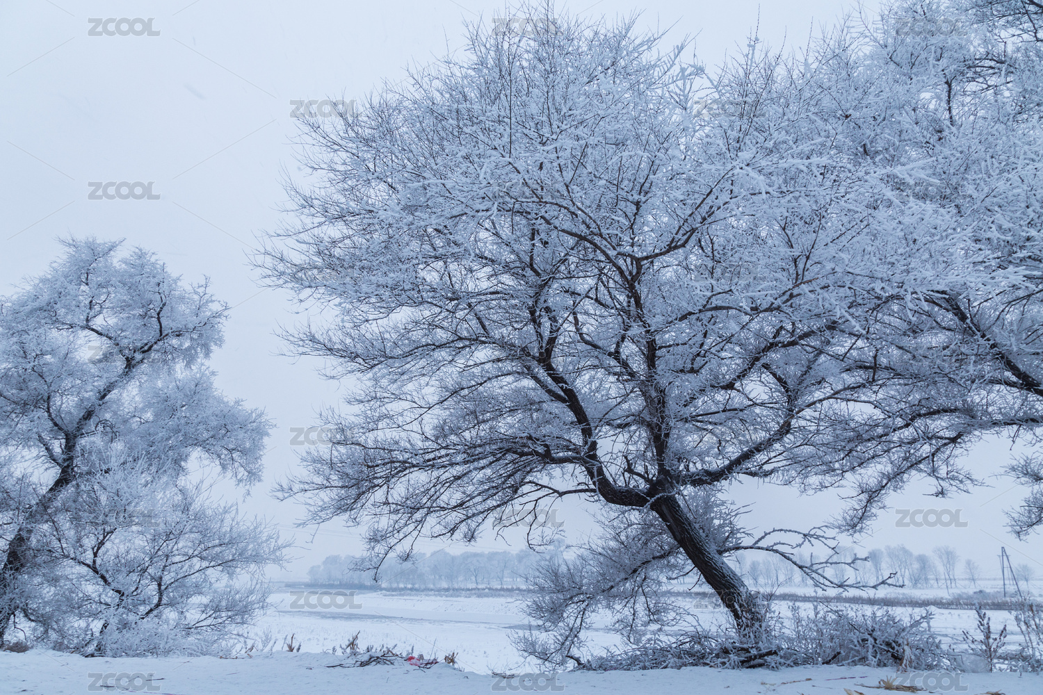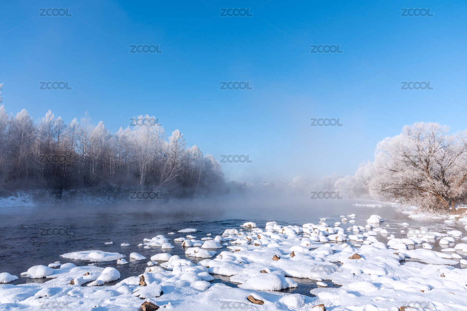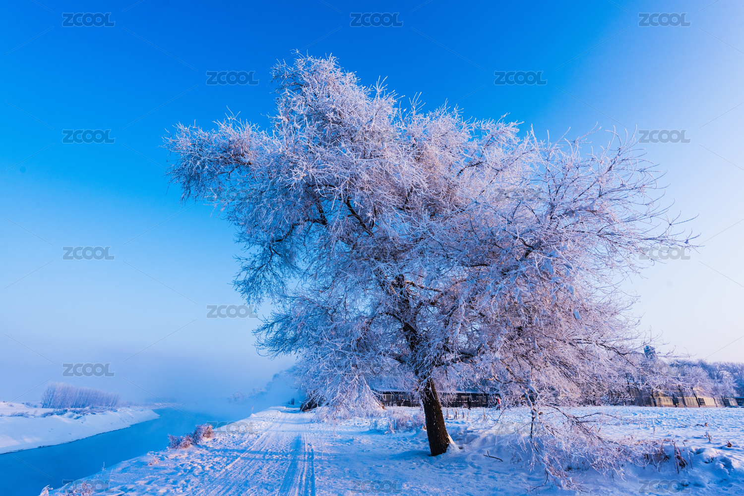 冬天雪地河流雾凇