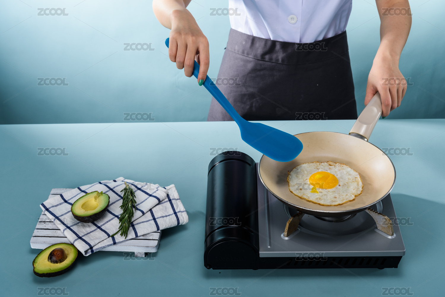 蓝色的铲勺煎鸡蛋蓝色背景