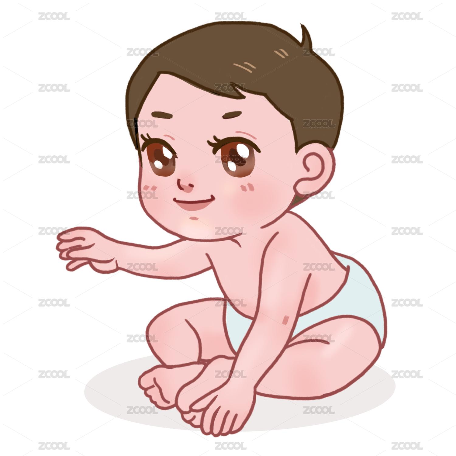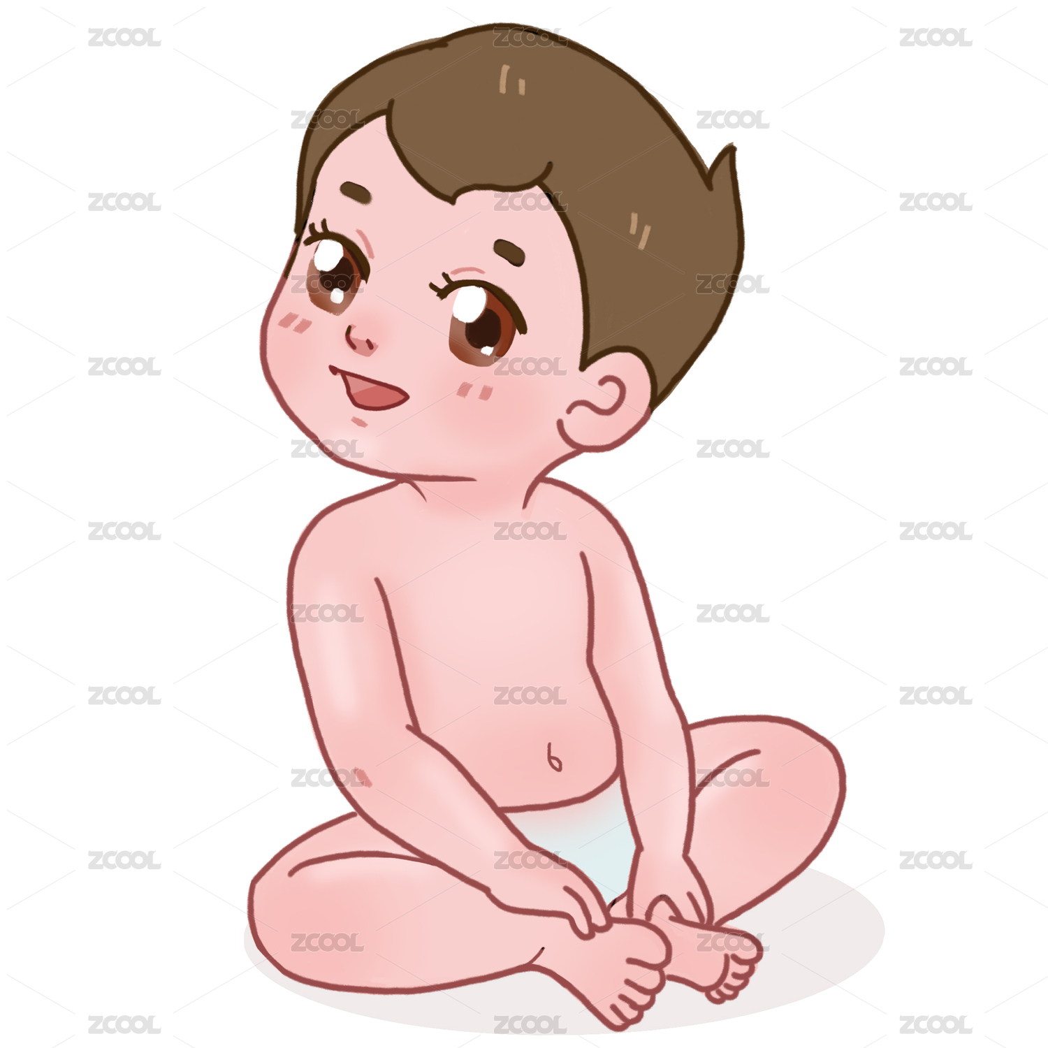 一个可爱的婴儿穿着尿布坐在地上 手绘插画